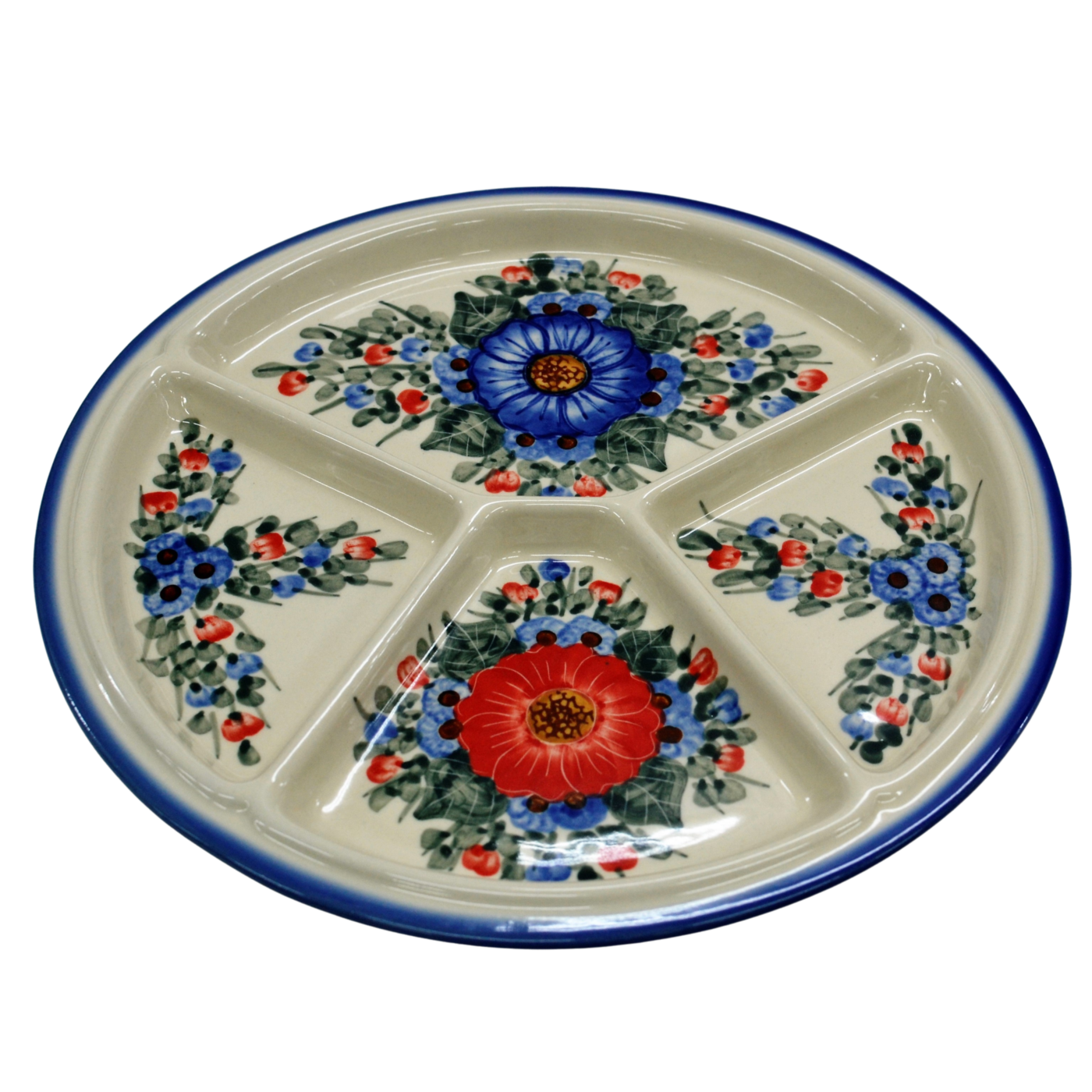 Talerze dzielony obiadowy to wspaniały pomysł na podanie na stół pięknie ułożonych i udekorowanych sałatek, surówek, mięs, ziemniaków, frytek, batatów. Potrawy umieszczone na talerzu mogą zostać ułożone w oryginalny sposób, oddzielone od siebie. Na talerzu można poukładać kolorowe sałatki, mięsa, warzywa. Wyjątkowy stół, oryginalnie podane potrawy, podczas Twojego przyjęcia, dzięki ręcznie wykonanym ceramicznym naczyniom ze zdobieniom podszkliwnym. Piękne, ręcznie dekorowane i glazurowane, talerze ceramiczne zdobione są różnokolorowymi wzorami, zieleń, czerwień, brąz, bolesławiecki kobalt, to to co dodaje wyjątkowej unikatowości i dyskretnej elegancji naczyń ceramicznych. Oryginalny talerz z Bolesławca, miasta ceramiki, niesamowicie wyróżni na stole tradycyjne polskie potrawy i te powstałe na wzór potraw kuchni całego świata.