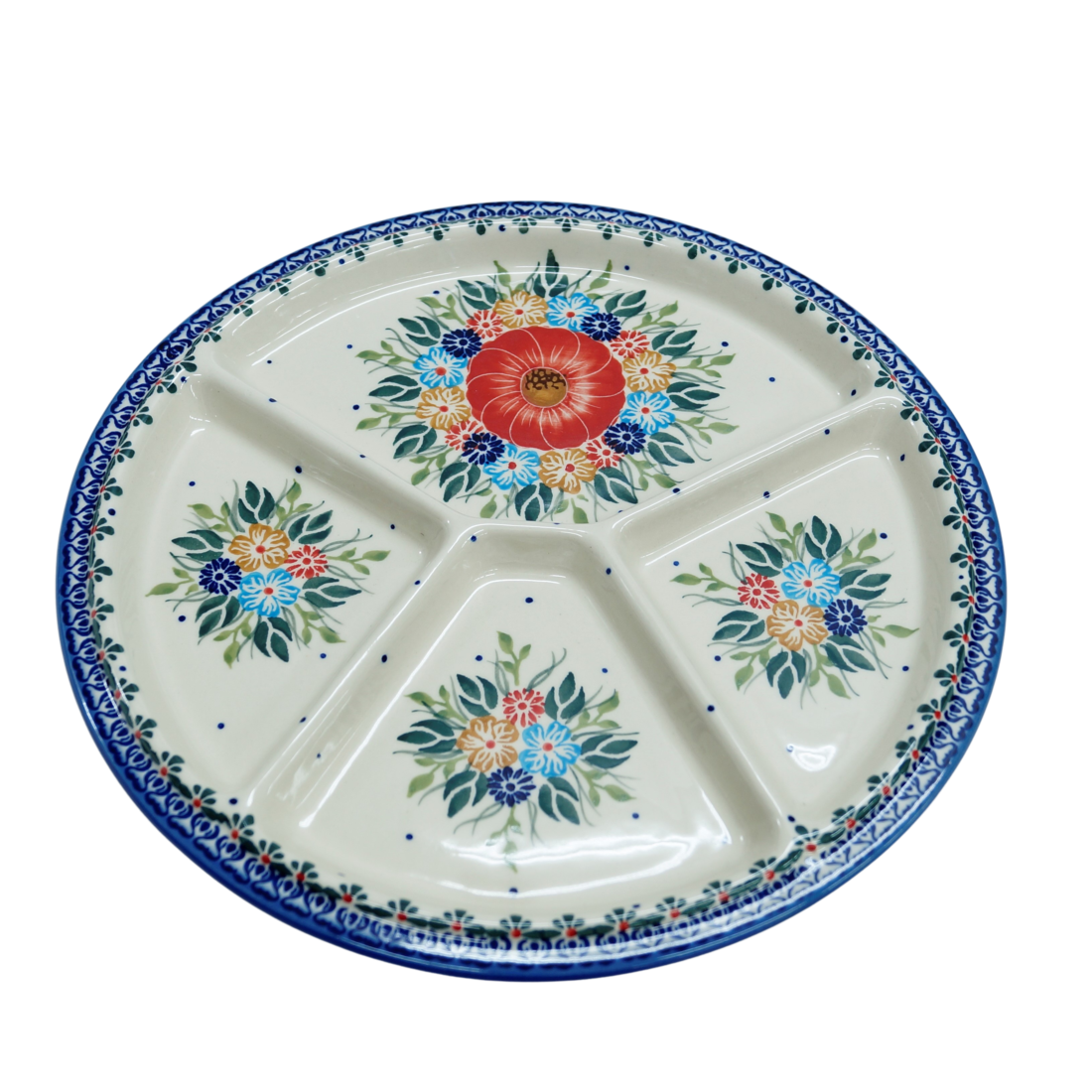 Talerze dzielony obiadowy to wspaniały pomysł na podanie na stół pięknie ułożonych i udekorowanych sałatek, surówek, mięs, ziemniaków, frytek, batatów. Potrawy umieszczone na talerzu mogą zostać ułożone w oryginalny sposób, oddzielone od siebie. Na talerzu można poukładać kolorowe sałatki, mięsa, warzywa. Wyjątkowy stół, oryginalnie podane potrawy, podczas Twojego przyjęcia, dzięki ręcznie wykonanym ceramicznym naczyniom ze zdobieniom podszkliwnym. Piękne, ręcznie dekorowane i glazurowane, talerze ceramiczne zdobione są różnokolorowymi wzorami, zieleń, czerwień, brąz, bolesławiecki kobalt, to to co dodaje wyjątkowej unikatowości i dyskretnej elegancji naczyń ceramicznych. Oryginalny talerz z Bolesławca, miasta ceramiki, niesamowicie wyróżni na stole tradycyjne polskie potrawy i te powstałe na wzór potraw kuchni całego świata.