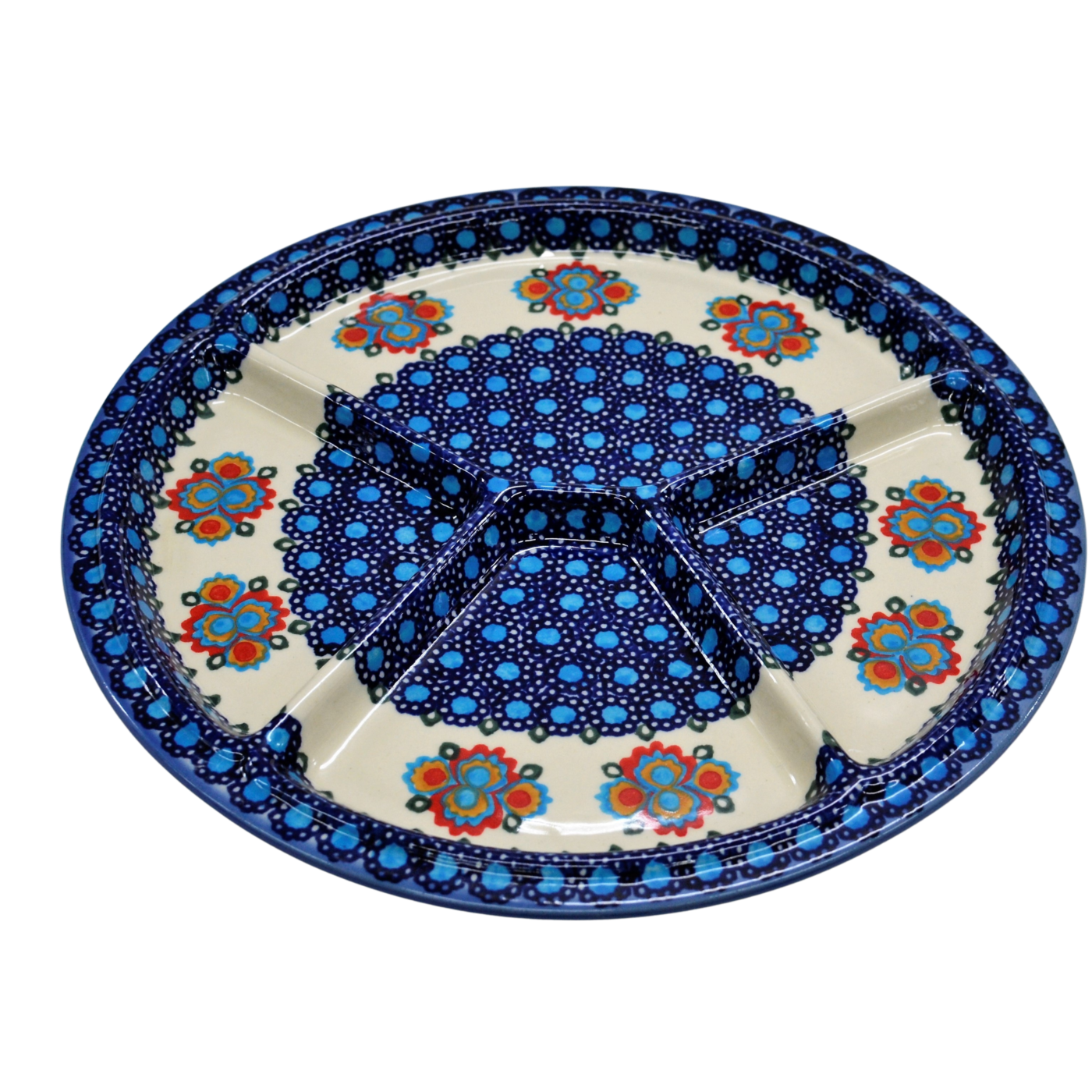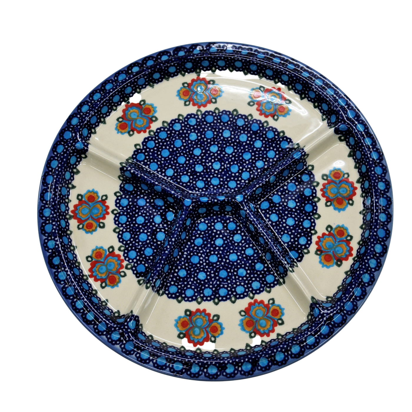 Talerze dzielony obiadowy to wspaniały pomysł na podanie na stół pięknie ułożonych i udekorowanych sałatek, surówek, mięs, ziemniaków, frytek, batatów. Potrawy umieszczone na talerzu mogą zostać ułożone w oryginalny sposób, oddzielone od siebie. Na talerzu można poukładać kolorowe sałatki, mięsa, warzywa. Wyjątkowy stół, oryginalnie podane potrawy, podczas Twojego przyjęcia, dzięki ręcznie wykonanym ceramicznym naczyniom ze zdobieniom podszkliwnym. Piękne, ręcznie dekorowane i glazurowane, talerze ceramiczne zdobione są różnokolorowymi wzorami, zieleń, czerwień, brąz, bolesławiecki kobalt, to to co dodaje wyjątkowej unikatowości i dyskretnej elegancji naczyń ceramicznych. Oryginalny talerz z Bolesławca, miasta ceramiki, niesamowicie wyróżni na stole tradycyjne polskie potrawy i te powstałe na wzór potraw kuchni całego świata.