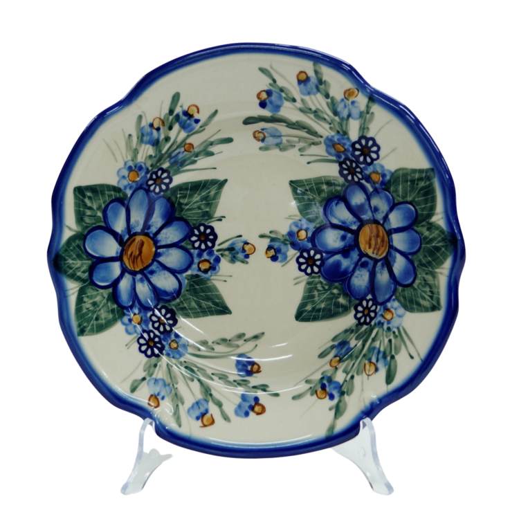 Talerz ten to oryginalna kamionka bolesławiecka, jest ręcznie malowana i wyprodukowana w Bolesławcu. Każda dekoracja ceramiki artystycznej z naszej rodzinnej manufaktury powstała z najwyższą dbałością o detale (ręcznie nakładane stempelki i z pasją malowane dekoracje kwiatowe).