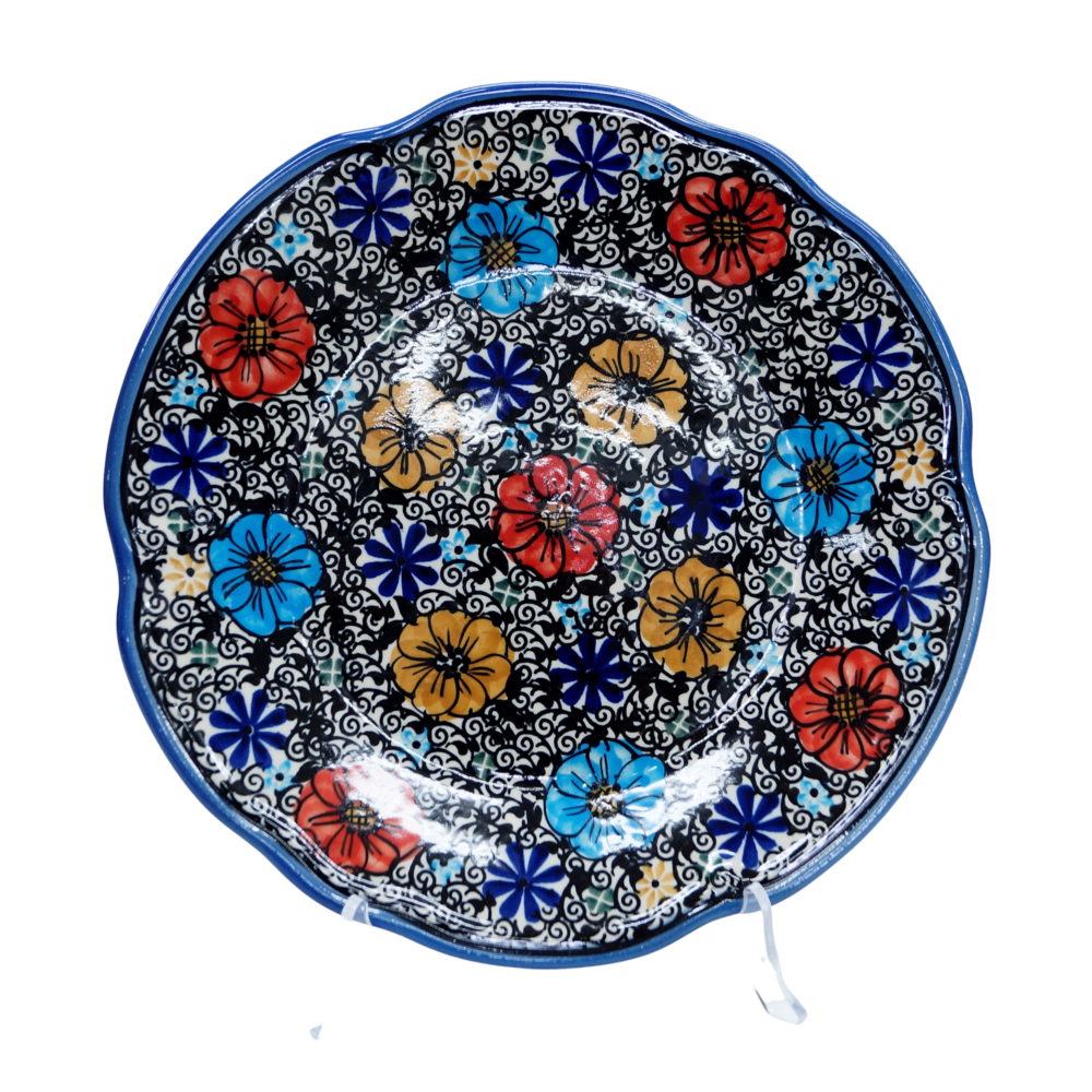 Talerz ten to oryginalna kamionka bolesławiecka, jest ręcznie malowana i wyprodukowana w Bolesławcu. Każda dekoracja ceramiki artystycznej z naszej rodzinnej manufaktury powstała z najwyższą dbałością o detale (ręcznie nakładane stempelki i z pasją malowane dekoracje kwiatowe).