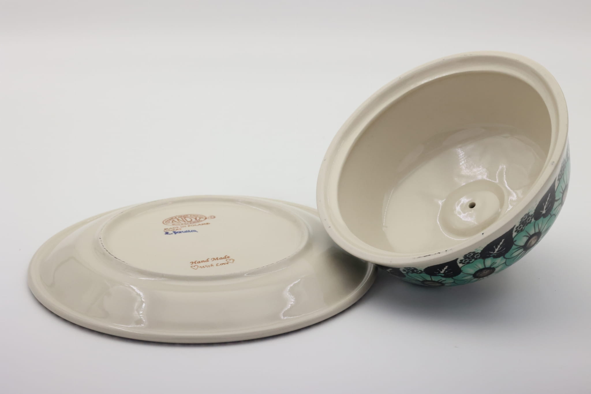 Prezentujemy nowość w naszej ofercie! Ręcznie dekorowany podszkliwnie w motywy ceramiki bolesławieckiej - talerz ceramiczny o średnicy 26 cm z pokrywą ceramiczną.