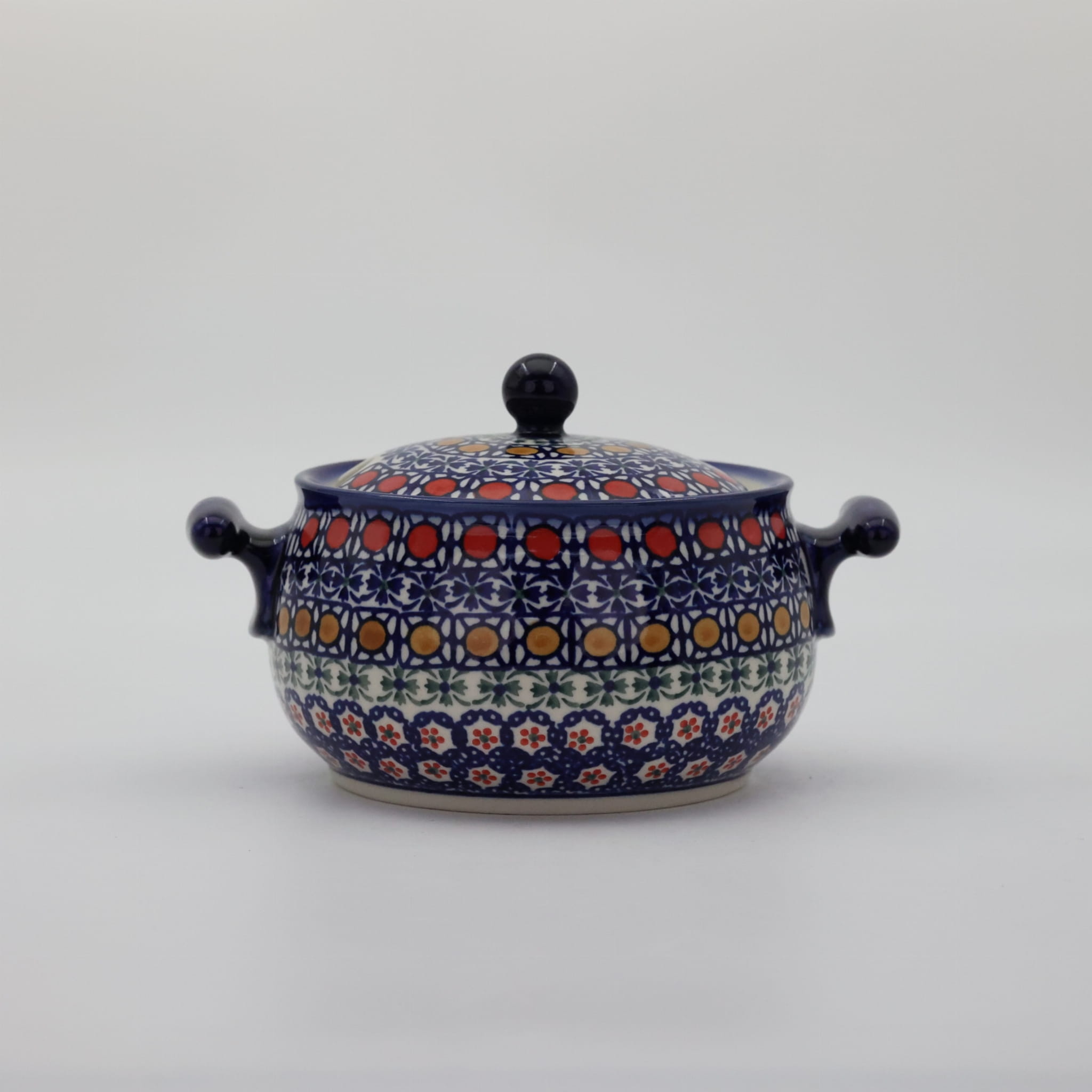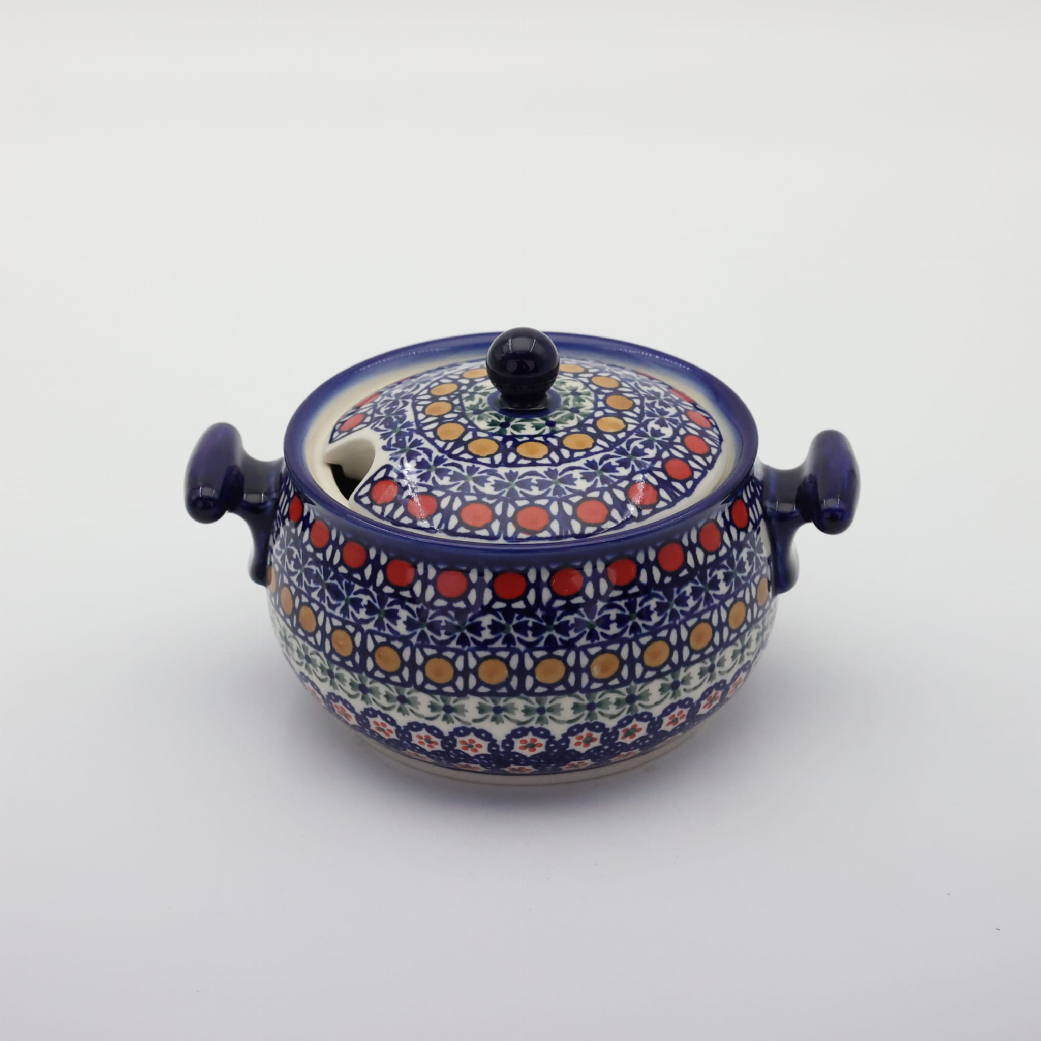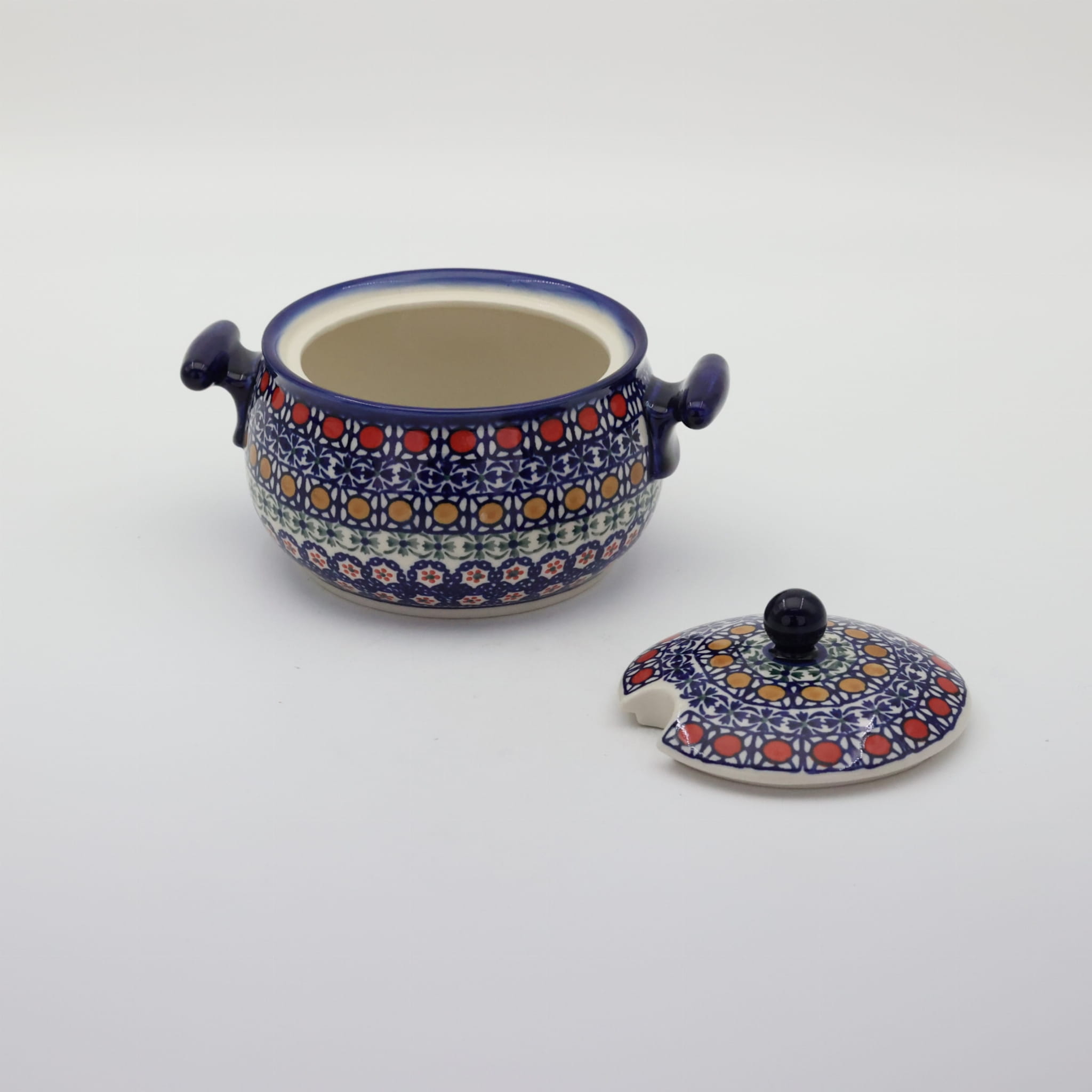 Waza ceramiczna z uszami mała z pokrywą i otworem na chochlę – ceramika bolesławiecka.