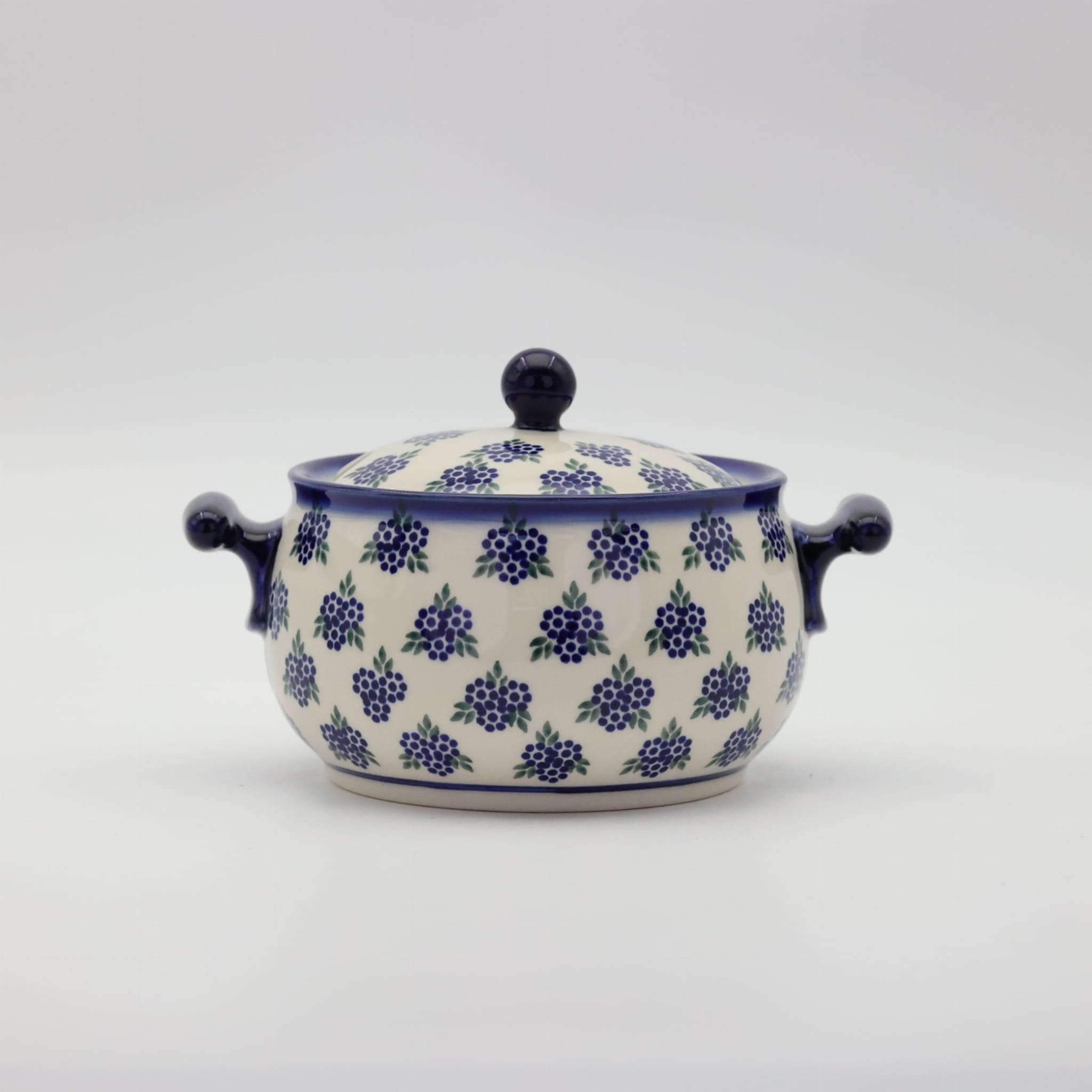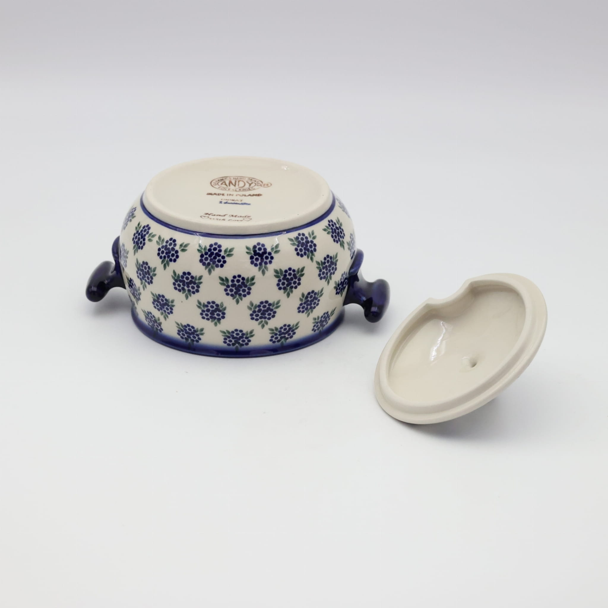 Waza ceramiczna z uszami mała z pokrywą i otworem na chochlę – ceramika bolesławiecka.
