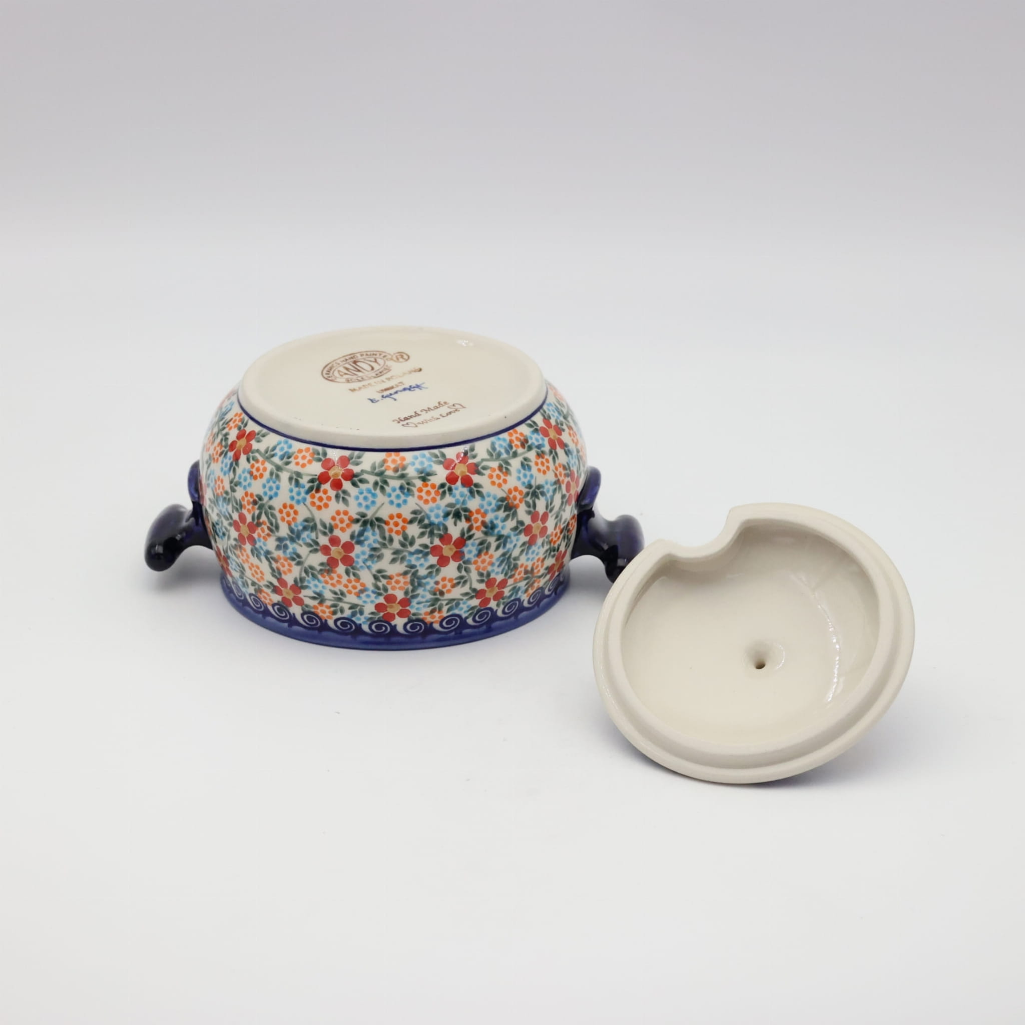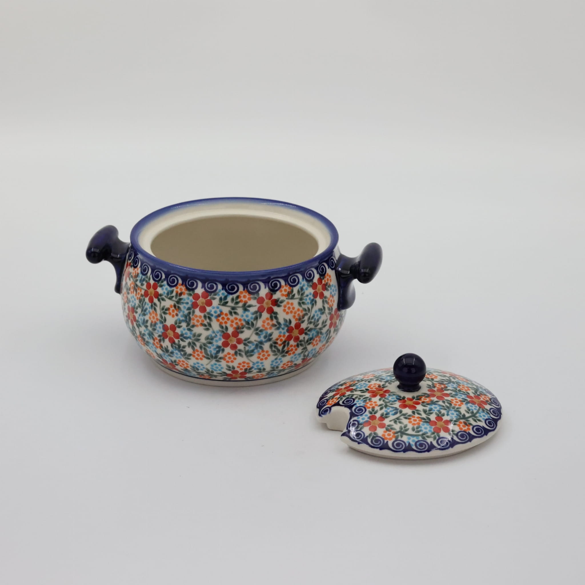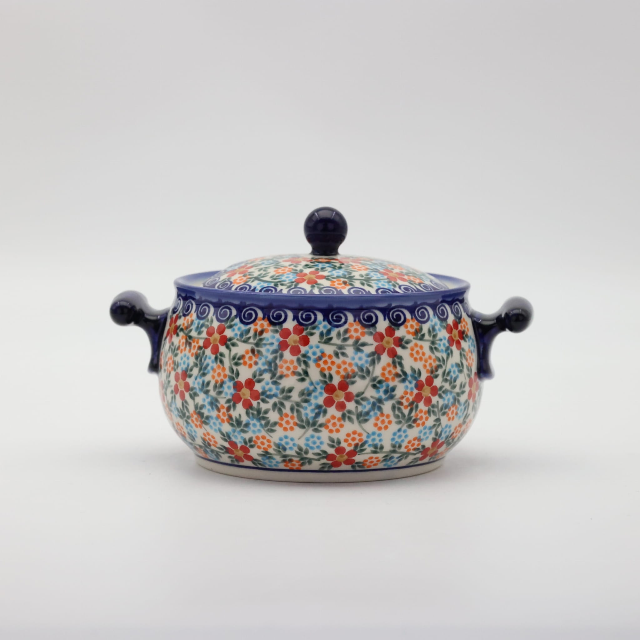 Waza ceramiczna z uszami mała z pokrywą i otworem na chochlę – ceramika bolesławiecka.