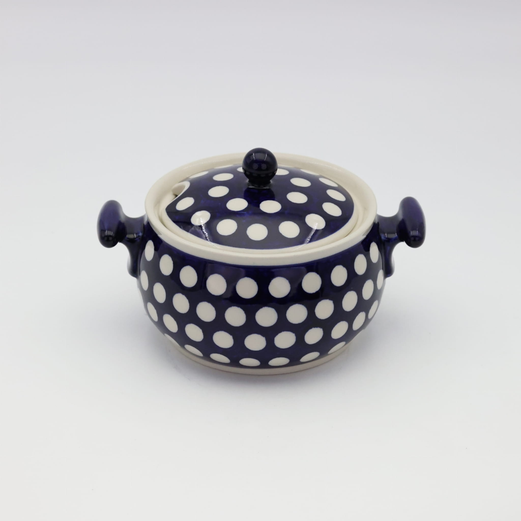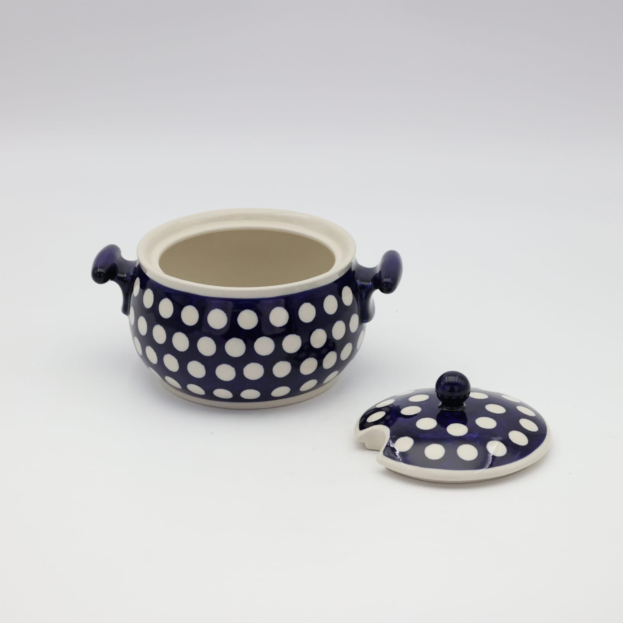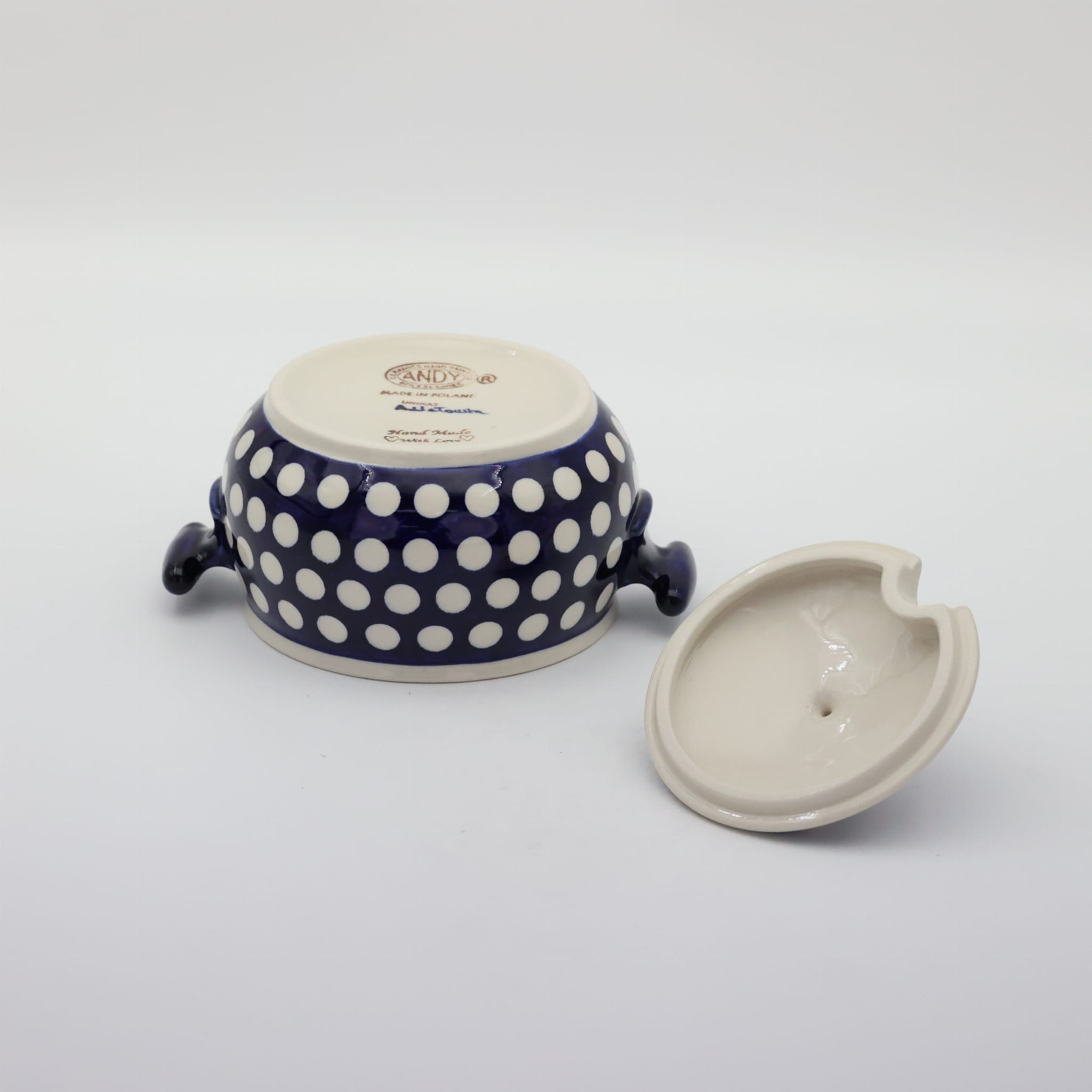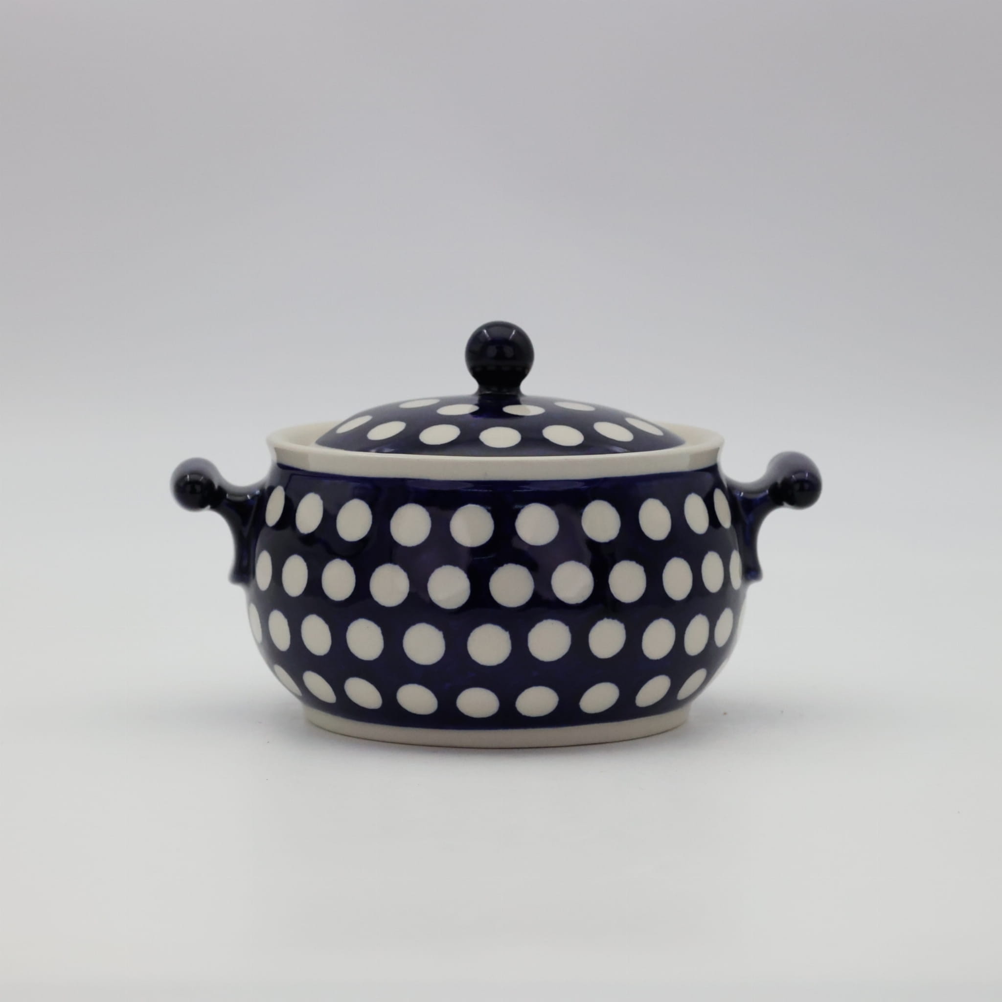 Waza ceramiczna z uszami mała z pokrywą i otworem na chochlę – ceramika bolesławiecka.