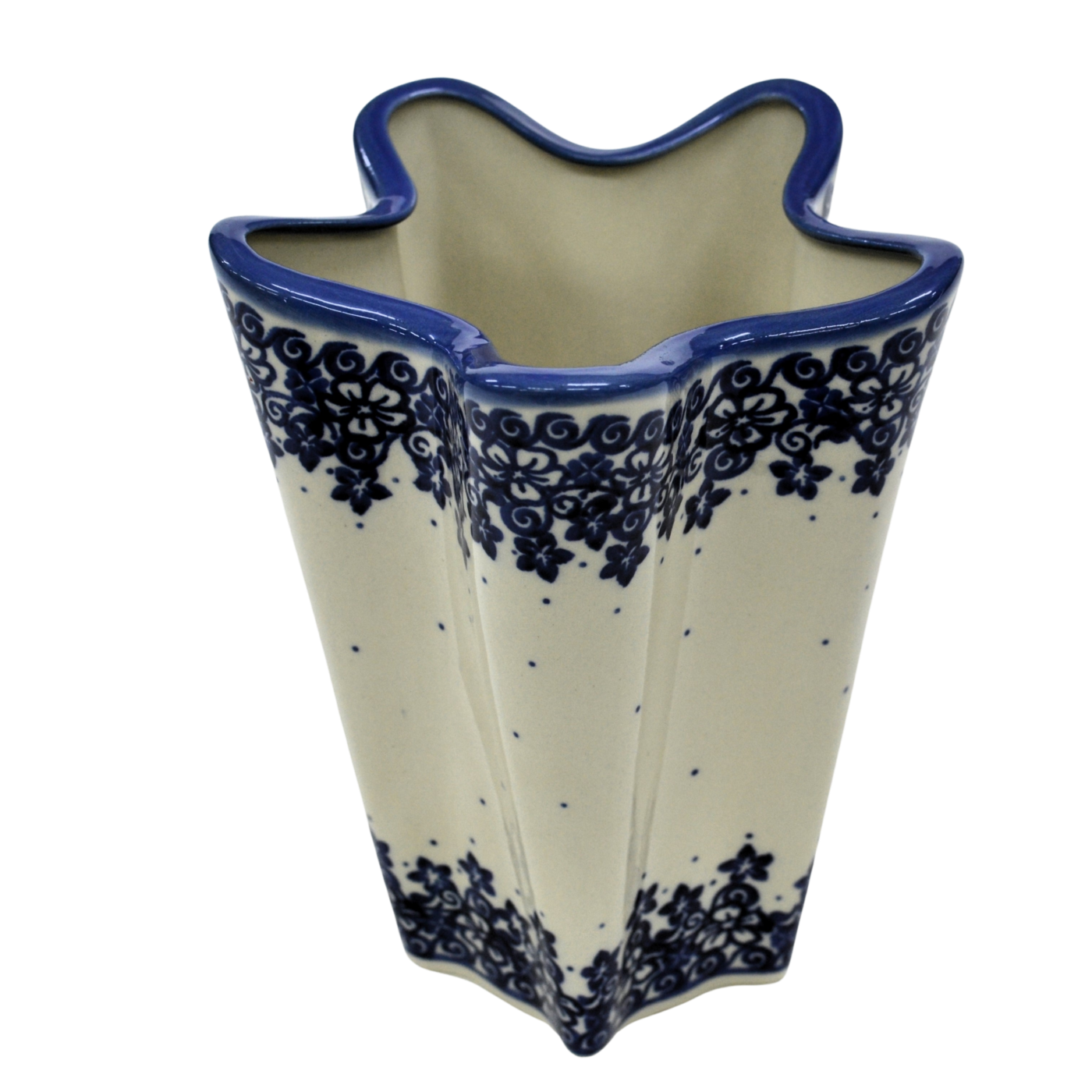 Oryginalny produkt ceramiki bolesławieckiej z zakładu ceramicznego, ANDY CERAMIKA, z Bolesławca. Ręcznie malowany w tradycyjne dekoracje stempelkowe oraz motywy kwiatowe. Kształt wazonu, wykrojony w nowoczesnym stylu, wzorowany na kwiecie lilii. Wazon jest prawdziwym kąskiem dla koneserów rękodzieła artystycznego z Dolnego Śląska.