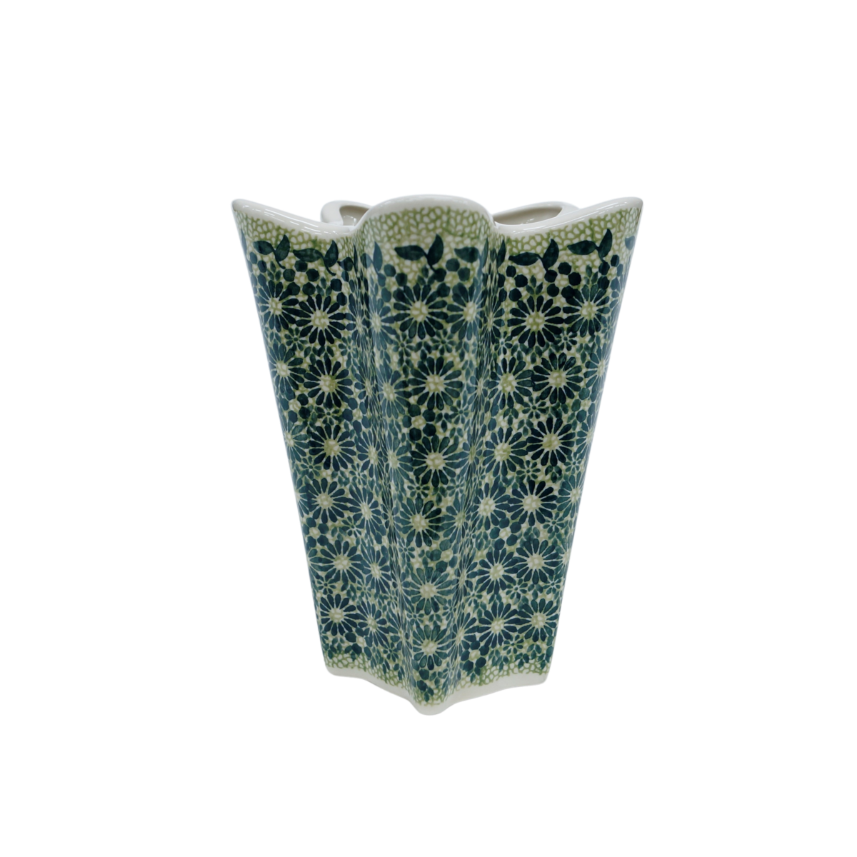 Oryginalny produkt ceramiki bolesławieckiej z zakładu ceramicznego, ANDY CERAMIKA, z Bolesławca. Ręcznie malowany w tradycyjne dekoracje stempelkowe oraz motywy kwiatowe. Kształt wazonu, wykrojony w nowoczesnym stylu, wzorowany na kwiecie lilii. Wazon jest prawdziwym kąskiem dla koneserów rękodzieła artystycznego z Dolnego Śląska.