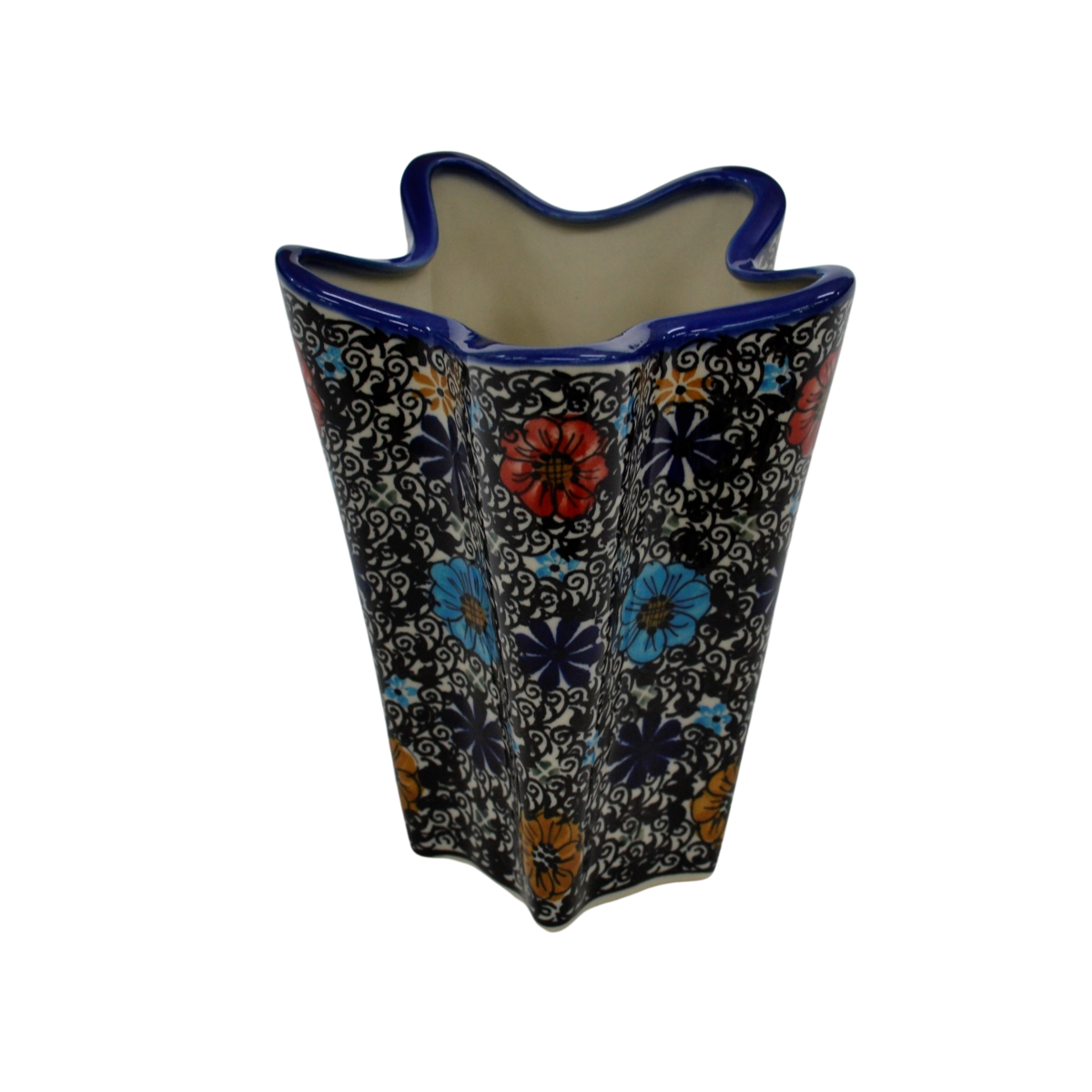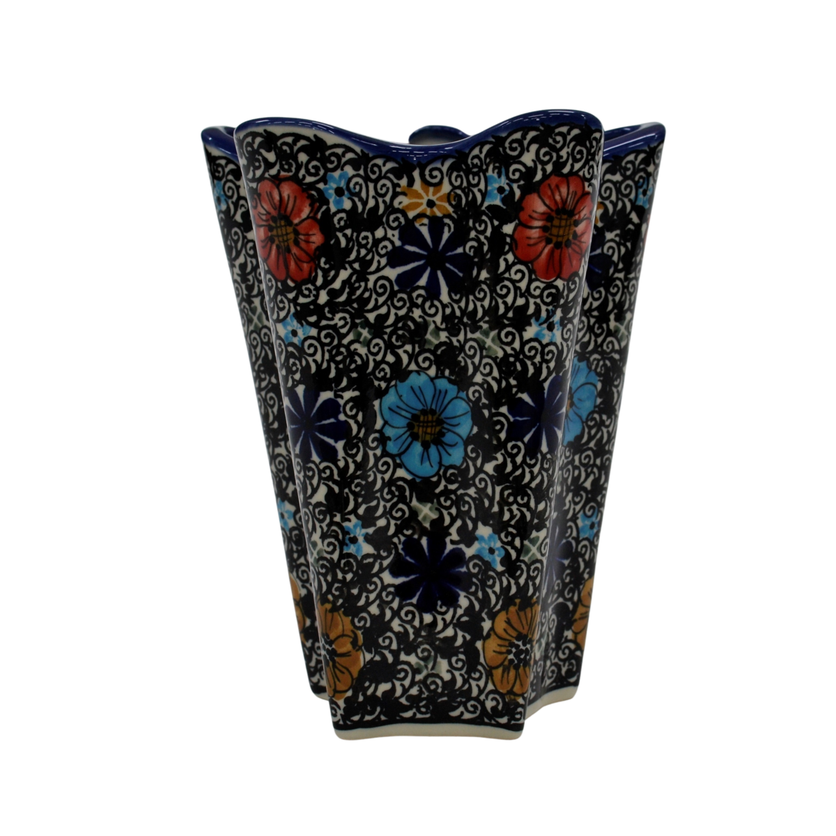 Oryginalny produkt ceramiki bolesławieckiej z zakładu ceramicznego, ANDY CERAMIKA, z Bolesławca. Ręcznie malowany w tradycyjne dekoracje stempelkowe oraz motywy kwiatowe. Kształt wazonu, wykrojony w nowoczesnym stylu, wzorowany na kwiecie lilii. Wazon jest prawdziwym kąskiem dla koneserów rękodzieła artystycznego z Dolnego Śląska.