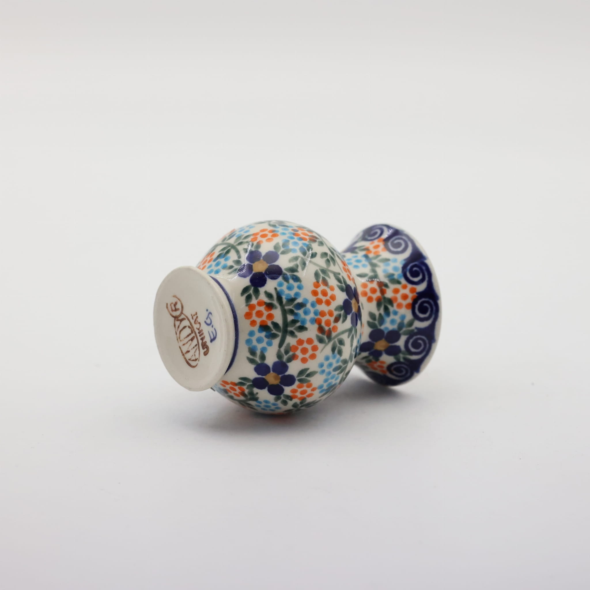 Ceramika bolesławiecka słynie z ręcznego zdobienia metodą stempelkową, a wazon „Kulka” jest doskonałym przykładem tej techniki. Każdy egzemplarz jest unikalnym dziełem sztuki, tworzonym przez doświadczonych rzemieślników, którzy z najwyższą precyzją nanoszą charakterystyczne wzory. Dominujące motywy, takie jak klasyczne kobaltowe kropki, pawie oczka, delikatne kwiaty czy geometryczne ornamenty, dodają wazonowi niepowtarzalnego charakteru i subtelnej elegancji.