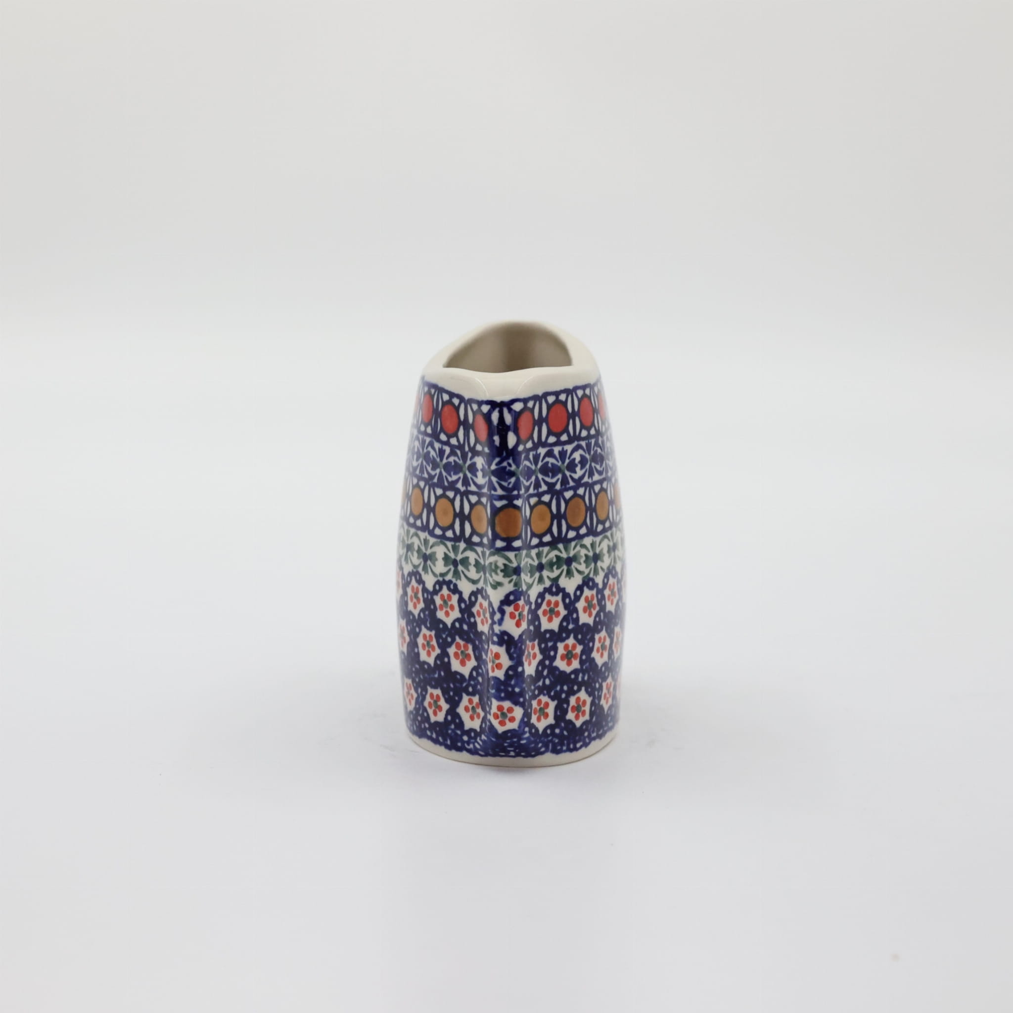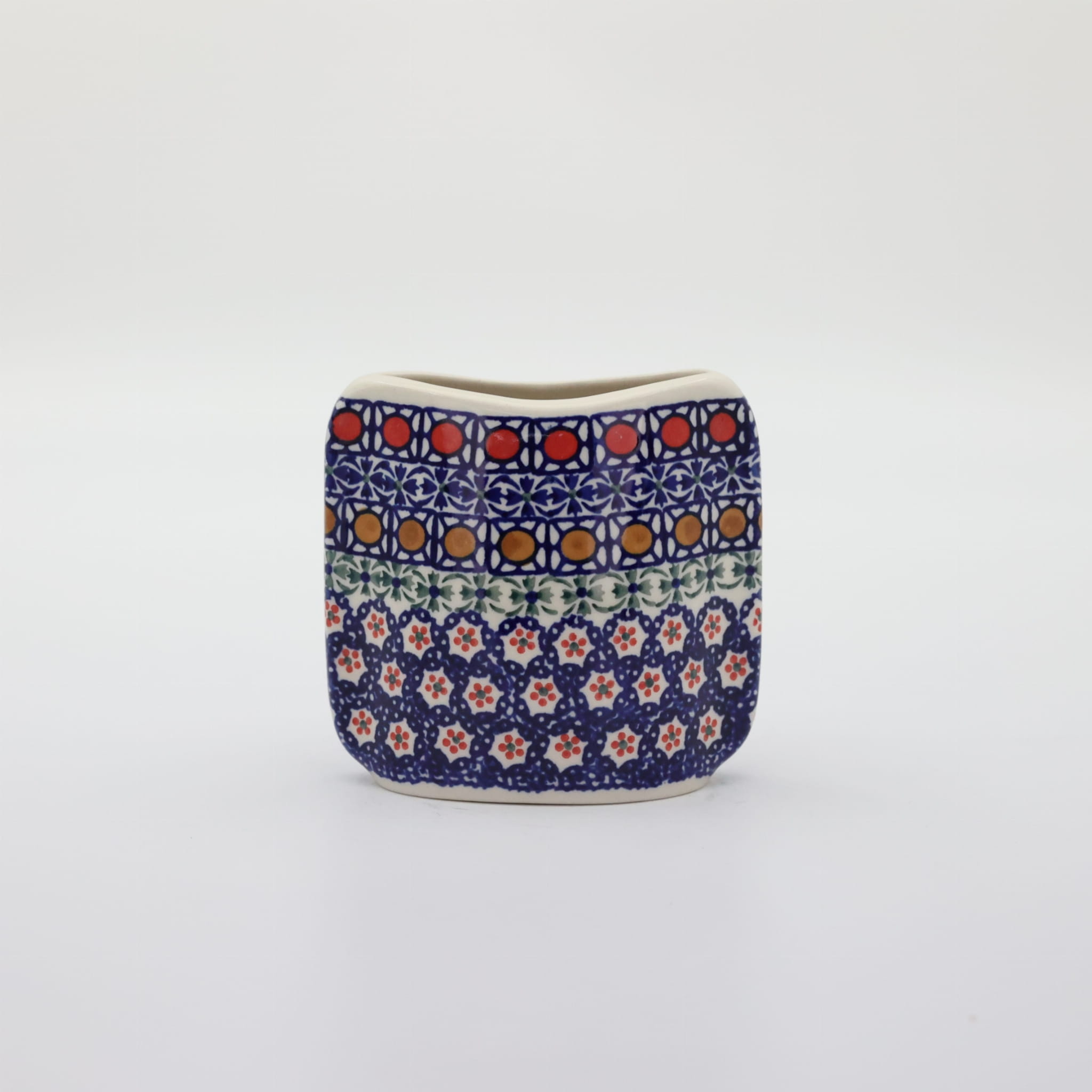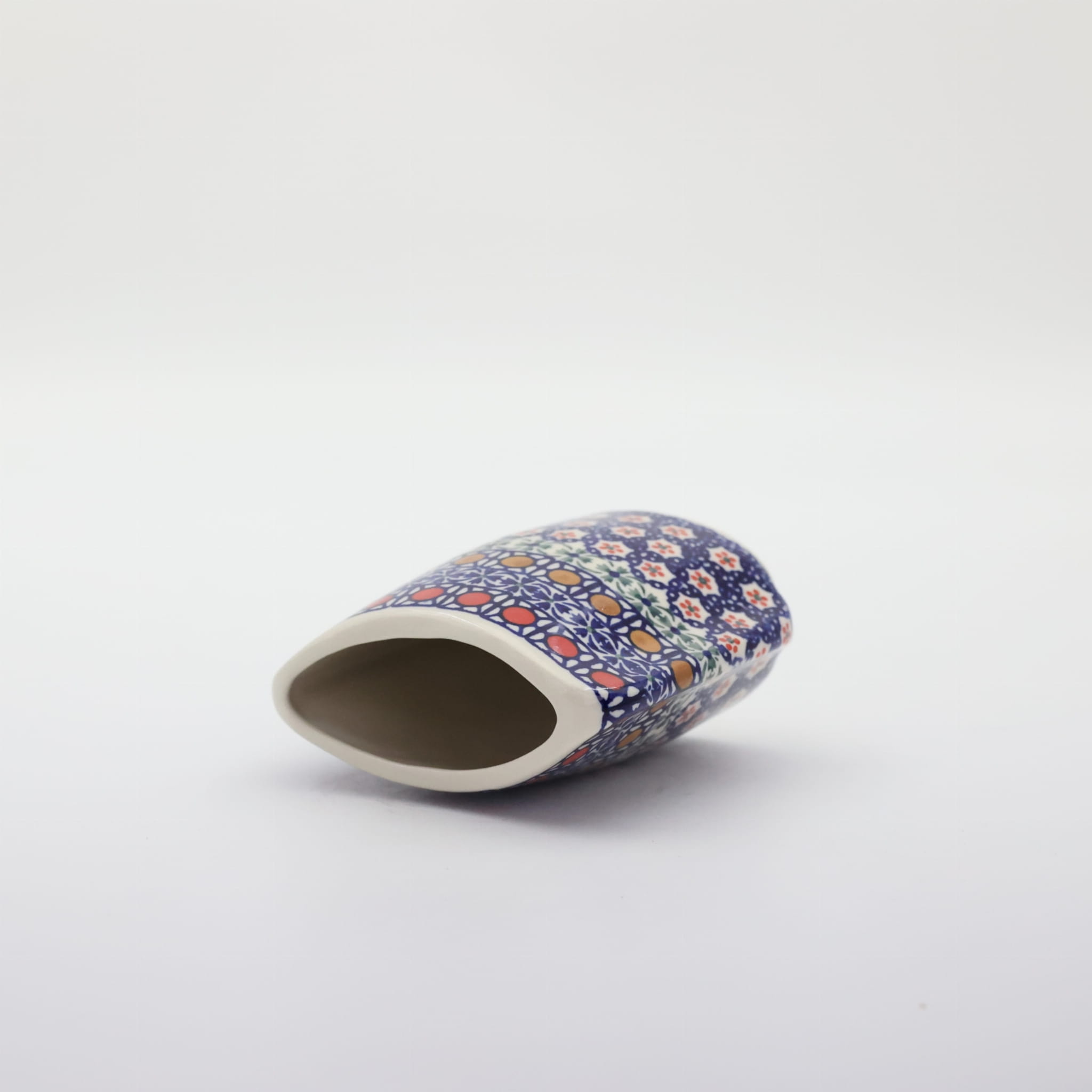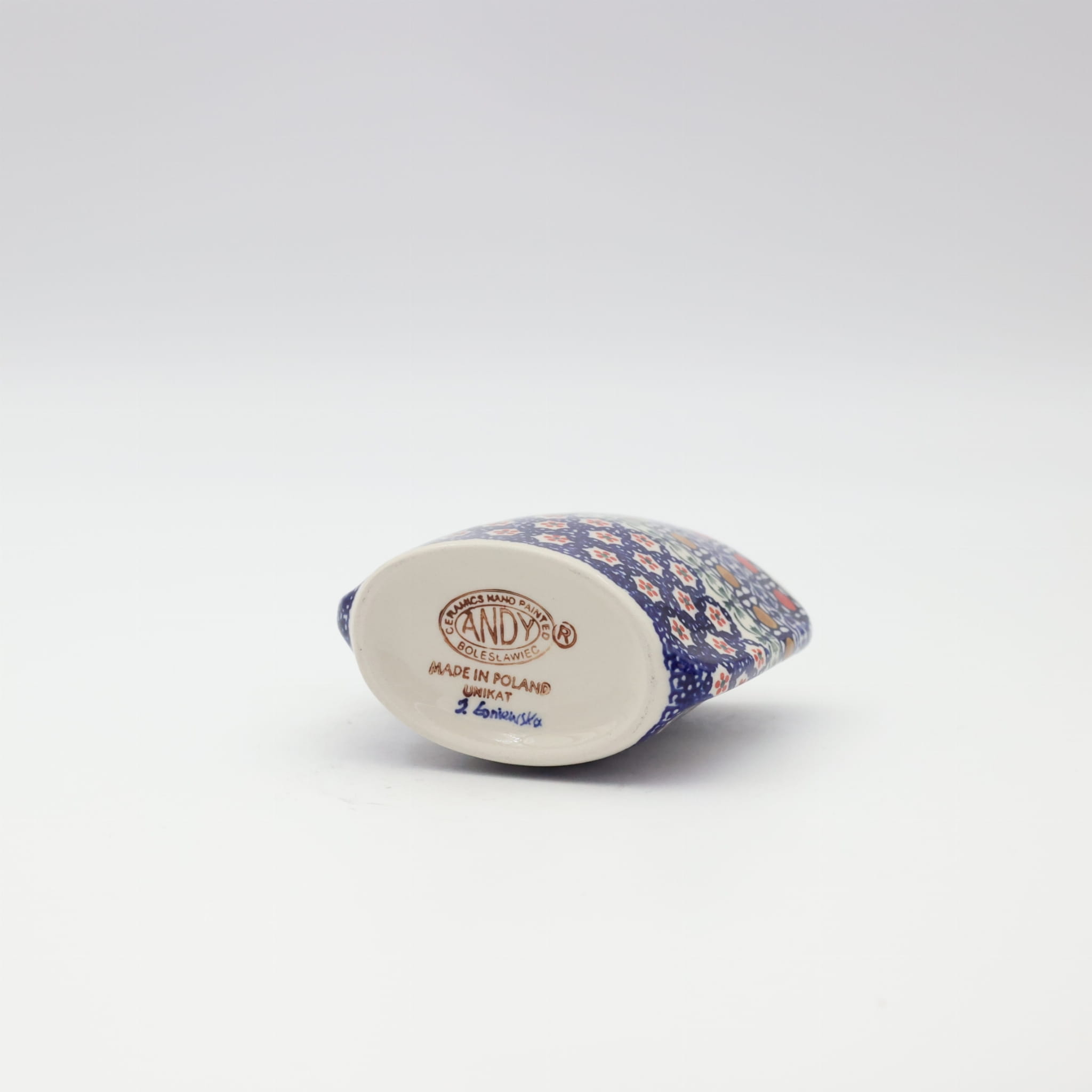 Oryginalny produkt ceramiki bolesławieckiej z zakładu ceramicznego, ANDY CERAMIKA z Bolesławca. Ręcznie malowany w tradycyjne dekoracje stempelkowe oraz motywy kwiatowe. Kształt wazon to spłaszczona bryła o pojemności 350 ml.