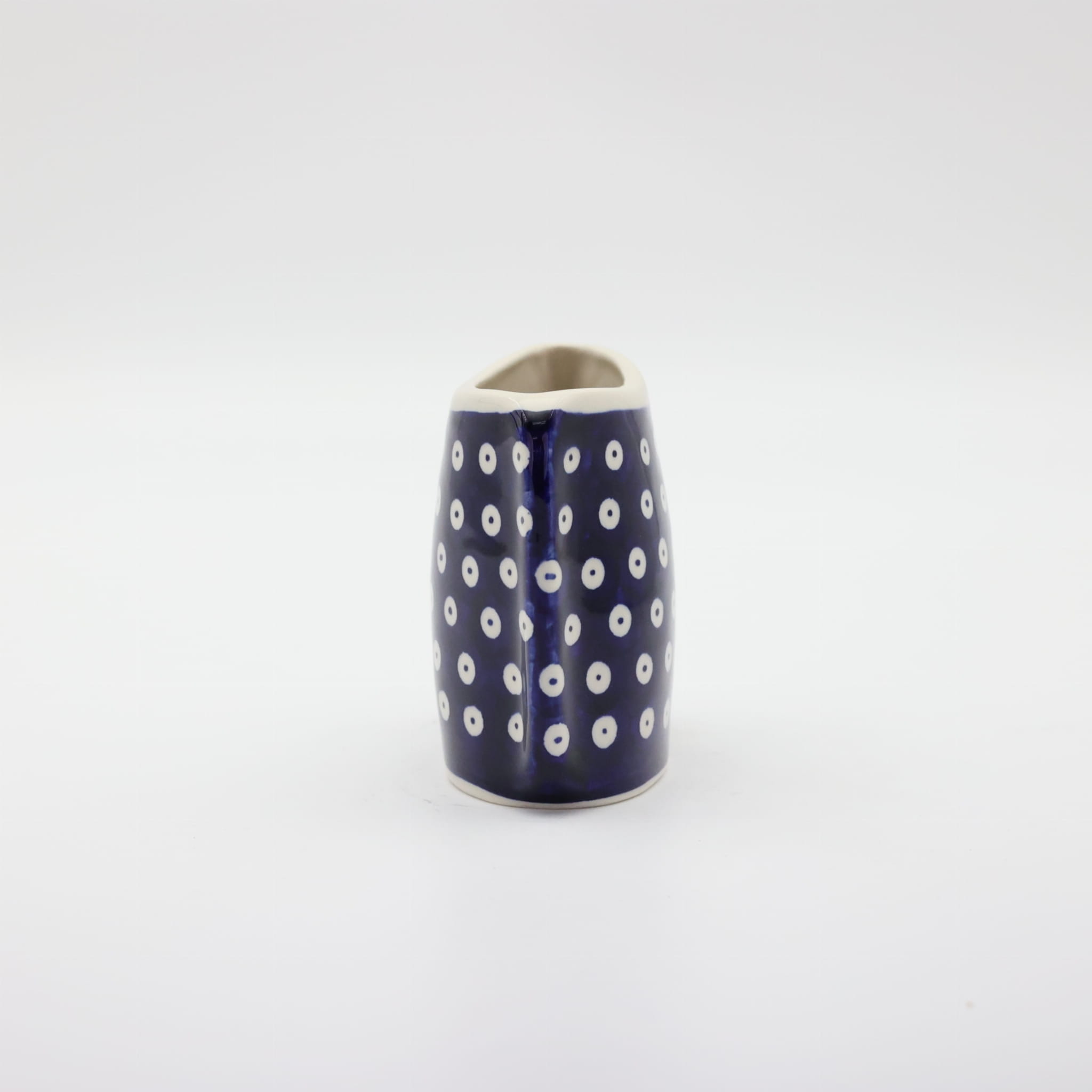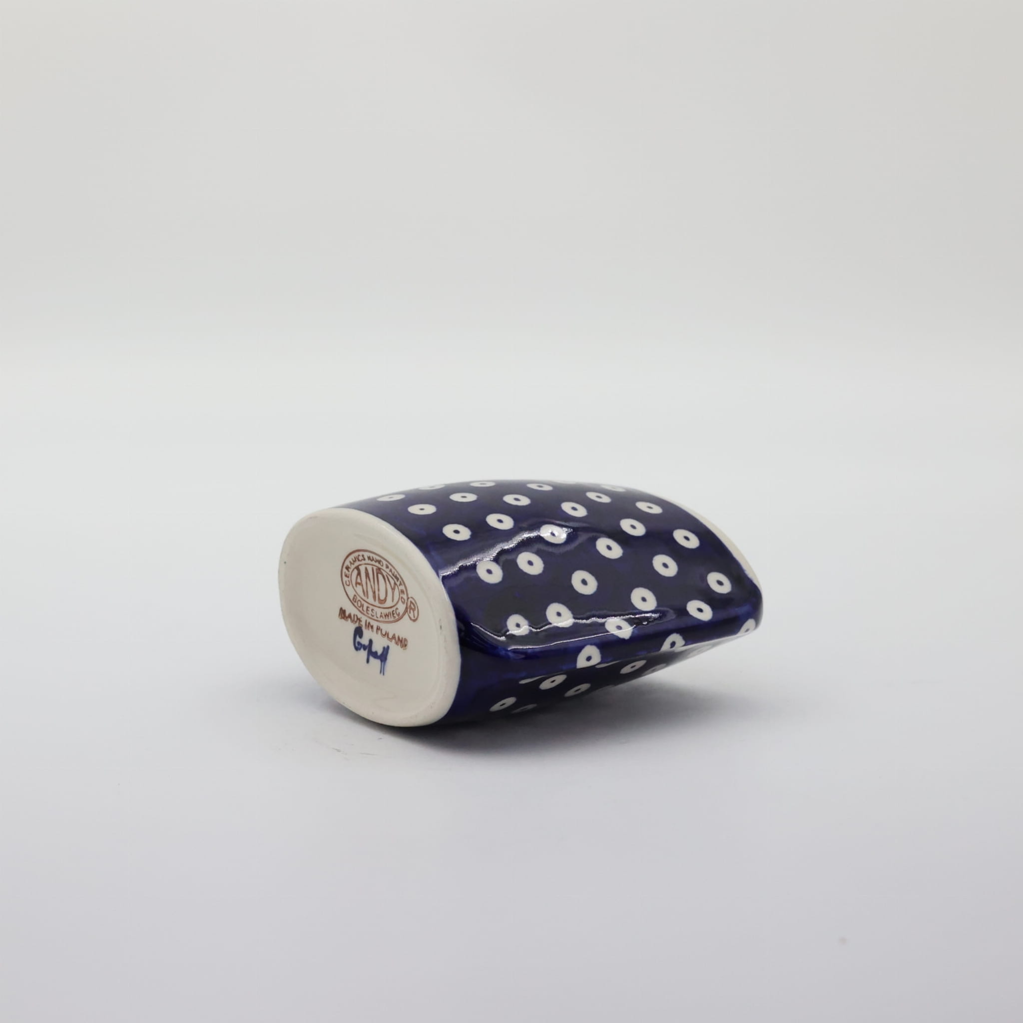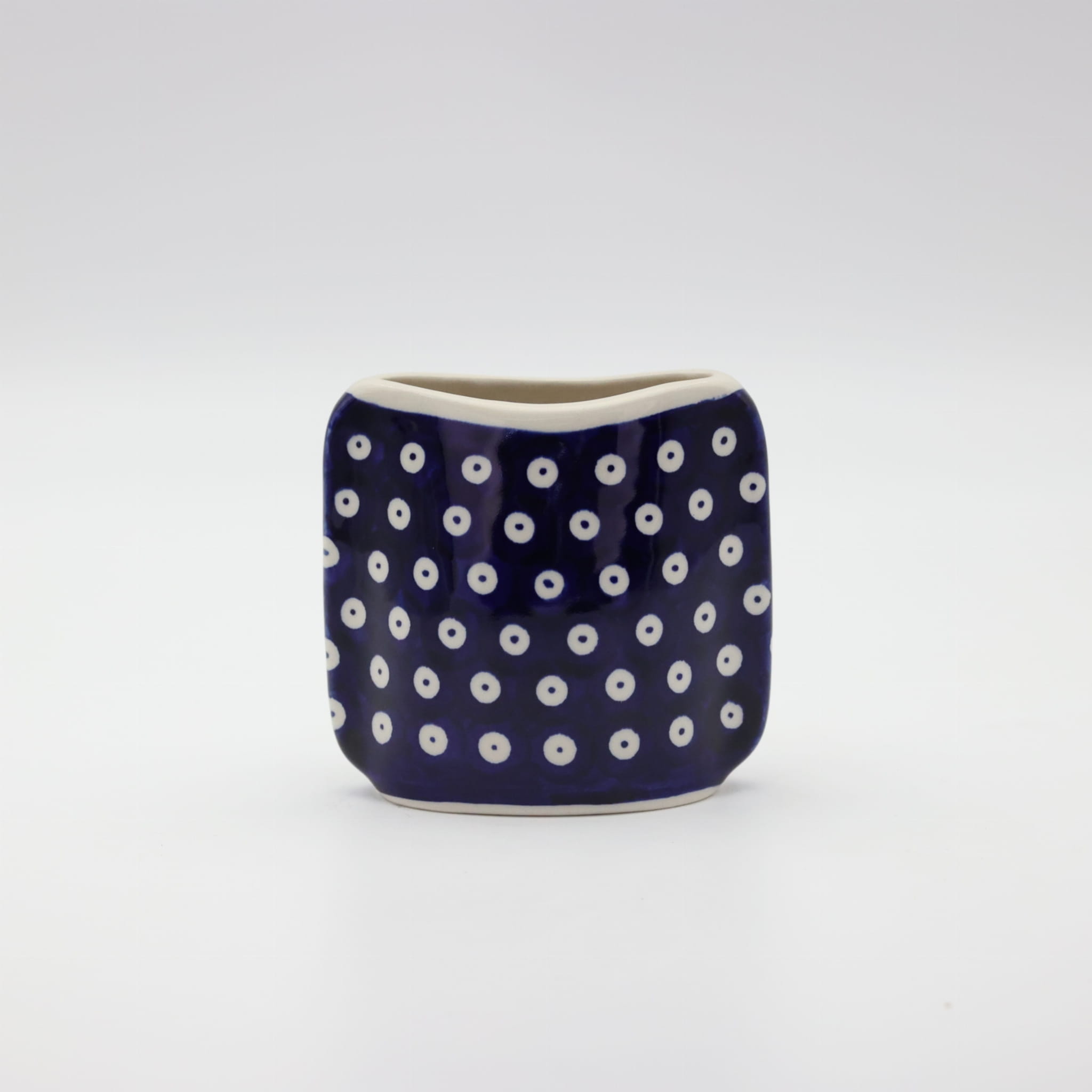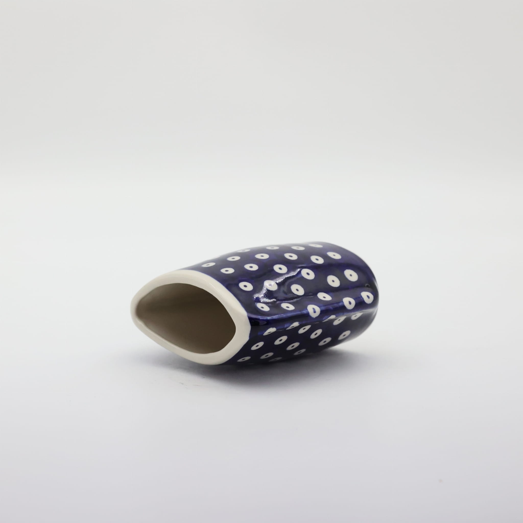 Oryginalny produkt ceramiki bolesławieckiej z zakładu ceramicznego, ANDY CERAMIKA z Bolesławca. Ręcznie malowany w tradycyjne dekoracje stempelkowe oraz motywy kwiatowe. Kształt wazon to spłaszczona bryła o pojemności 350 ml.