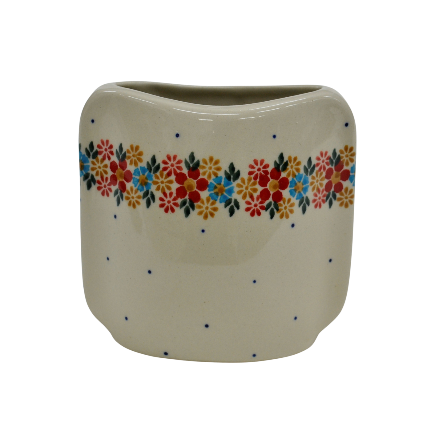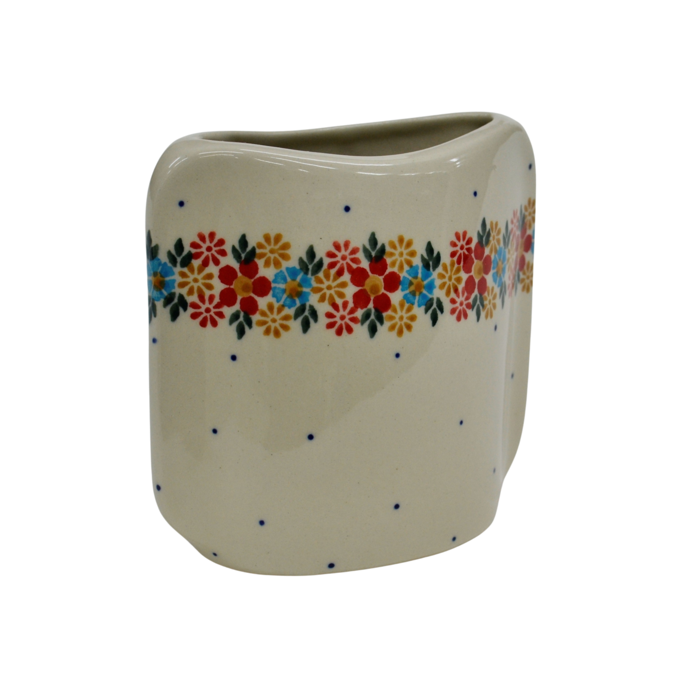 Oryginalny produkt ceramiki bolesławieckiej z zakładu ceramicznego, ANDY CERAMIKA z Bolesławca. Ręcznie malowany w tradycyjne dekoracje stempelkowe oraz motywy kwiatowe. Kształt wazon to spłaszczona bryła o pojemności 350 ml.