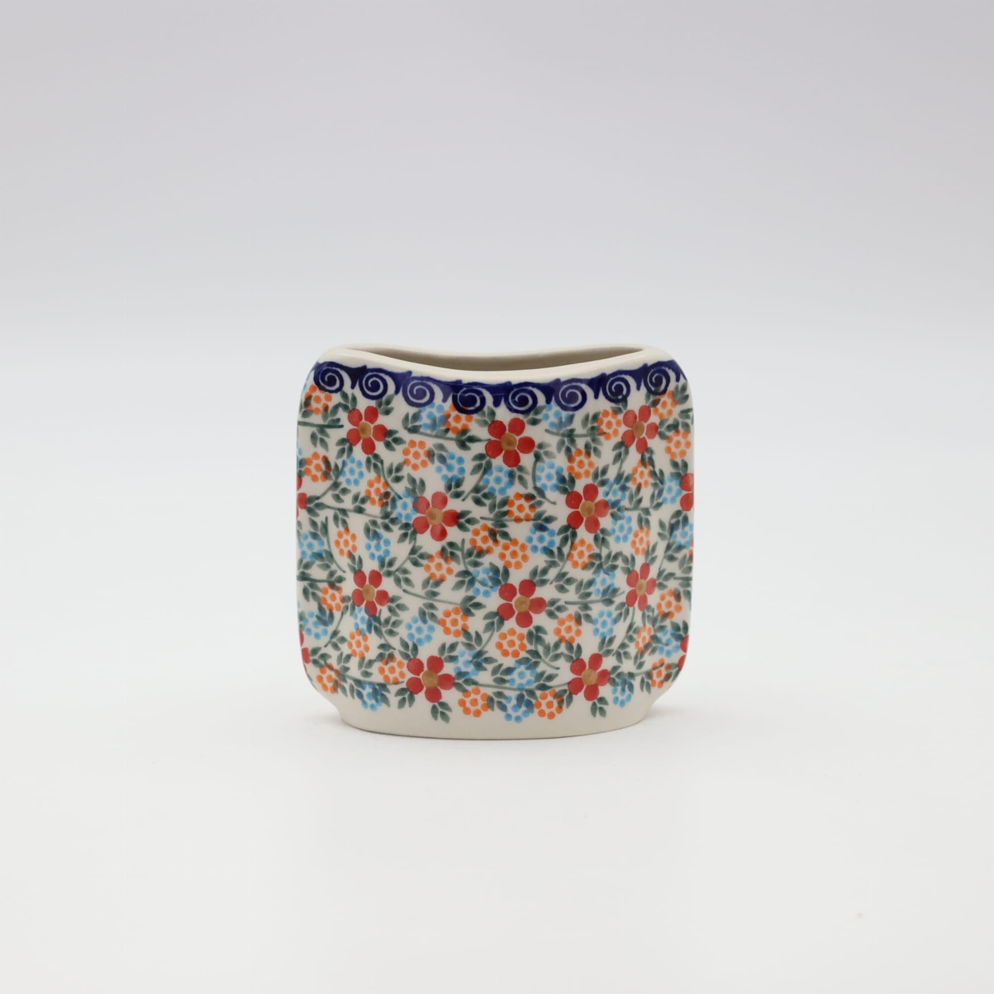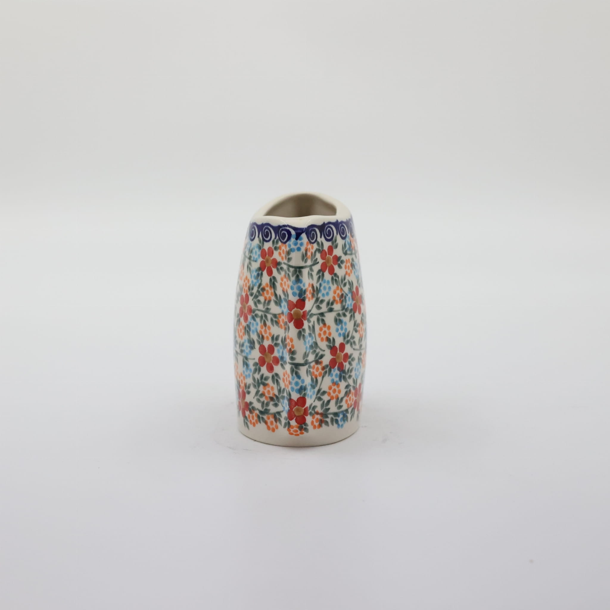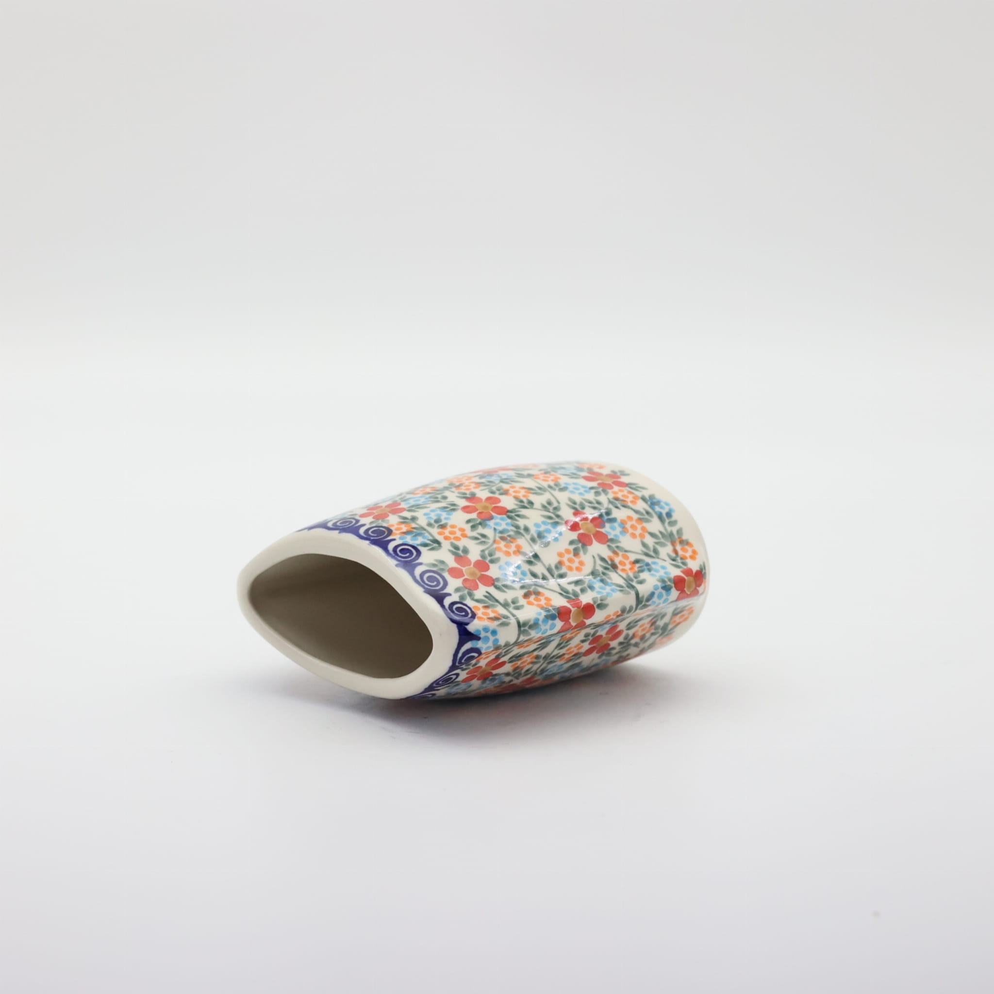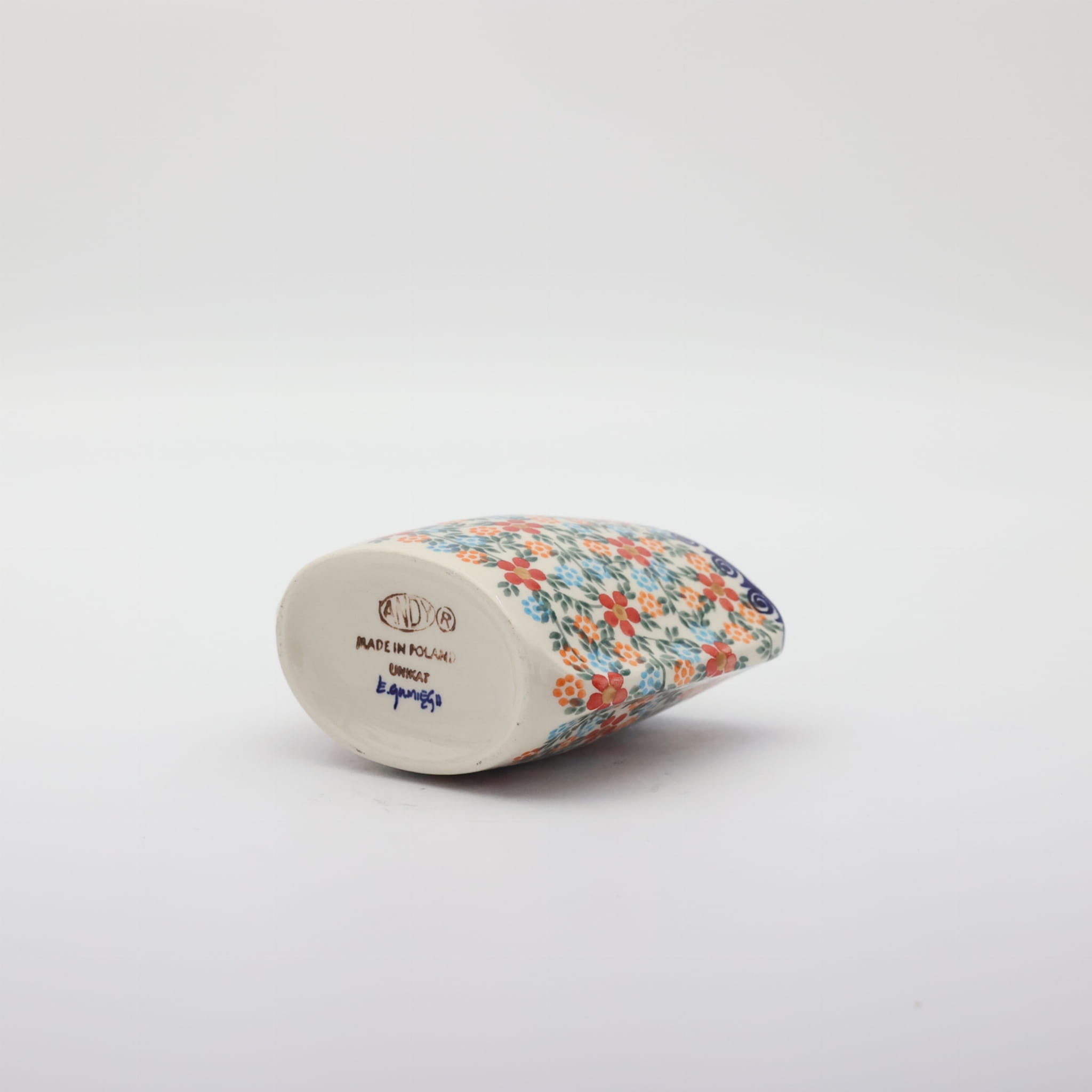 Oryginalny produkt ceramiki bolesławieckiej z zakładu ceramicznego, ANDY CERAMIKA z Bolesławca. Ręcznie malowany w tradycyjne dekoracje stempelkowe oraz motywy kwiatowe. Kształt wazon to spłaszczona bryła o pojemności 350 ml.