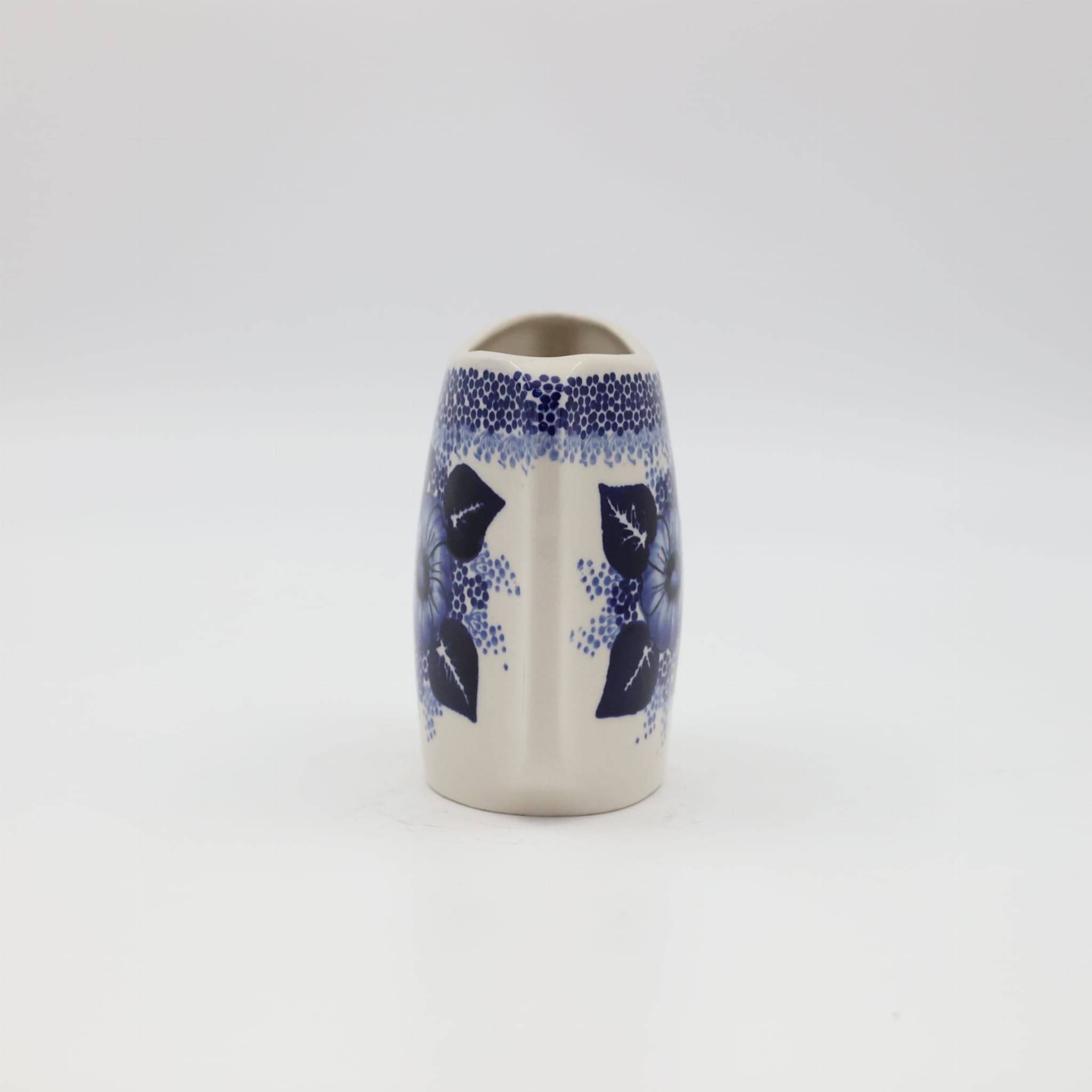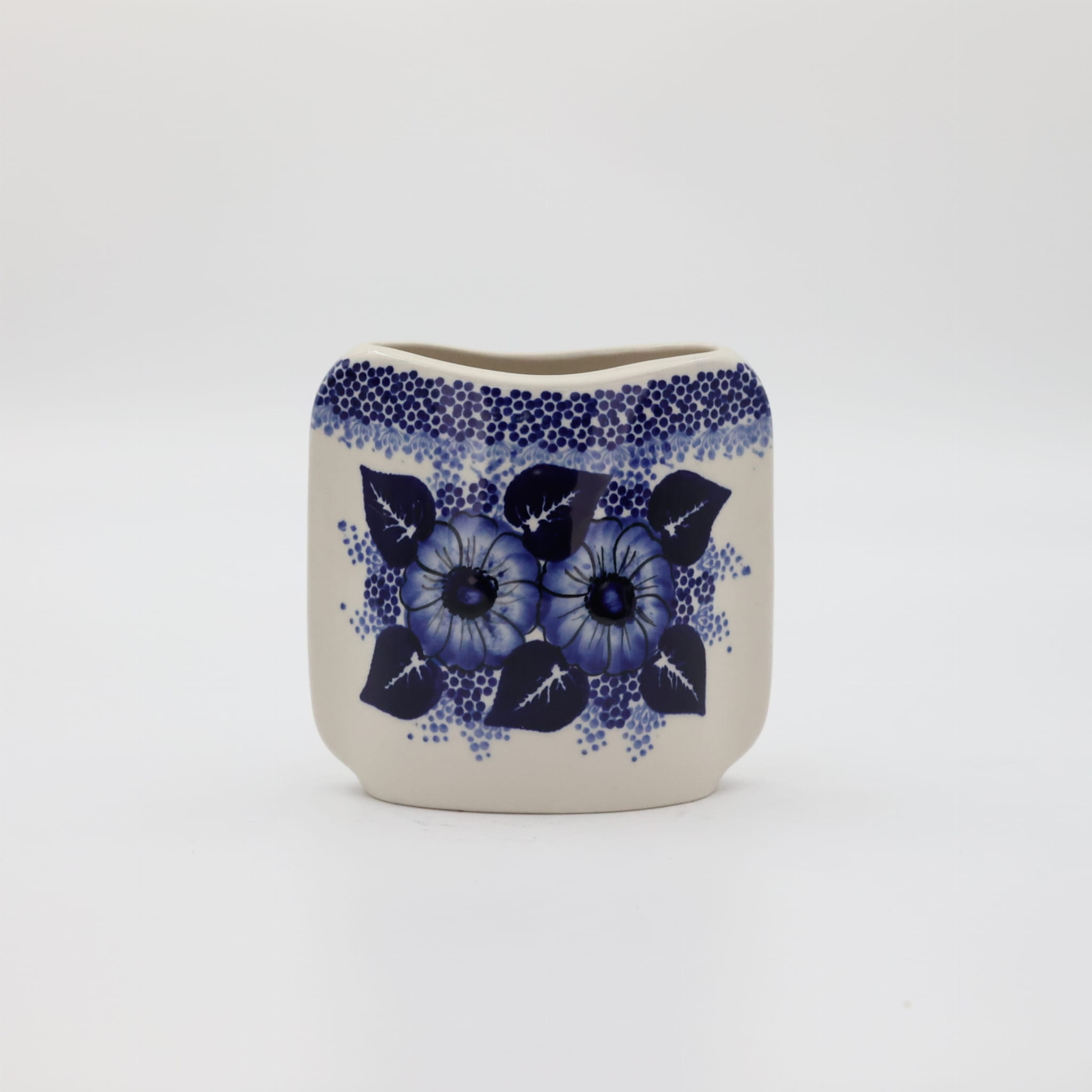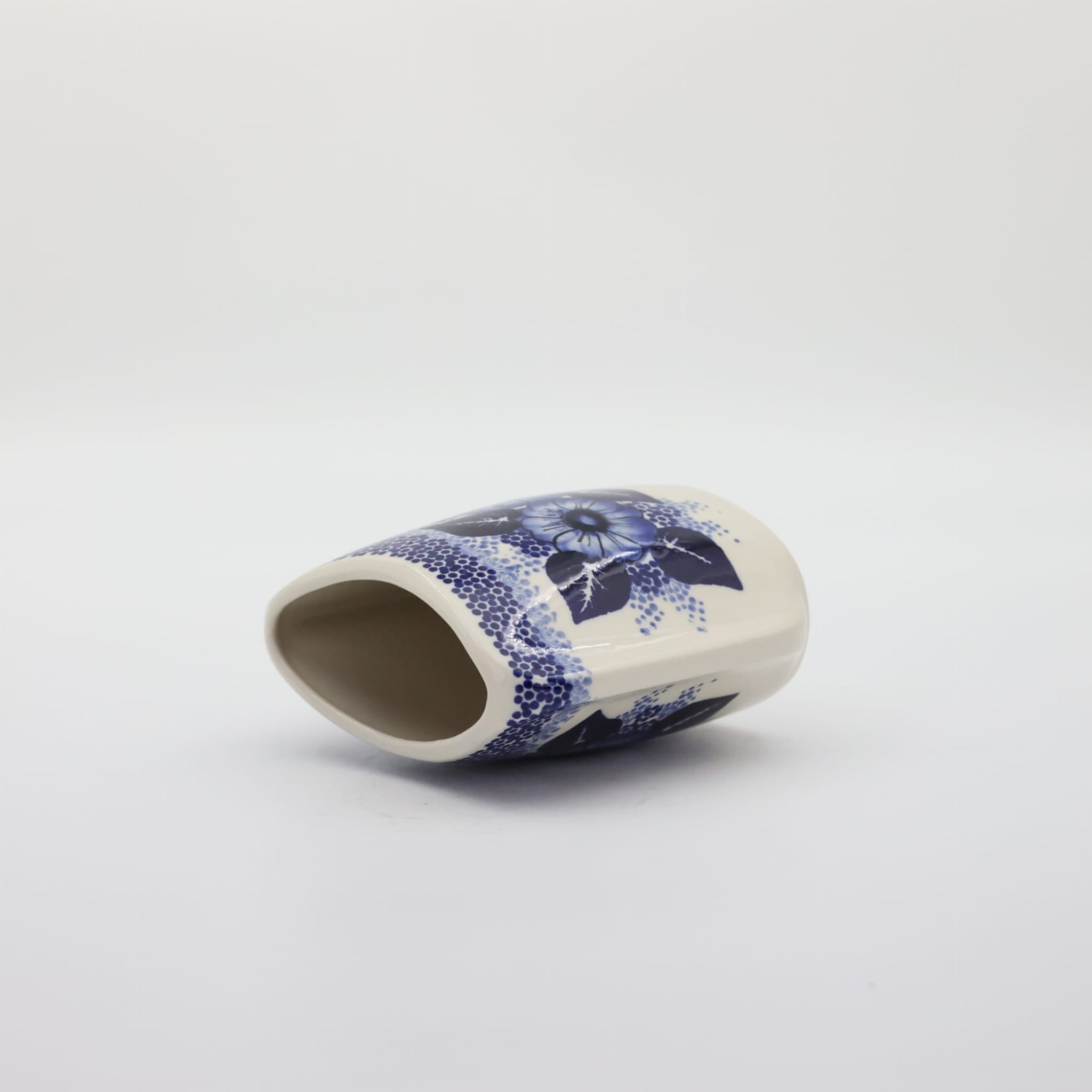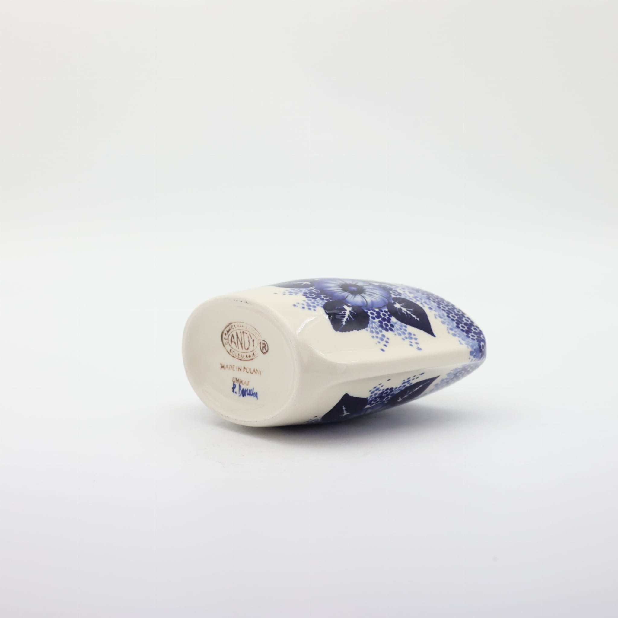 Oryginalny produkt ceramiki bolesławieckiej z zakładu ceramicznego, ANDY CERAMIKA z Bolesławca. Ręcznie malowany w tradycyjne dekoracje stempelkowe oraz motywy kwiatowe. Wazon ceramiczny na kwiaty. Kształt wazonu to spłaszczona bryła o pojemności 550 ml.