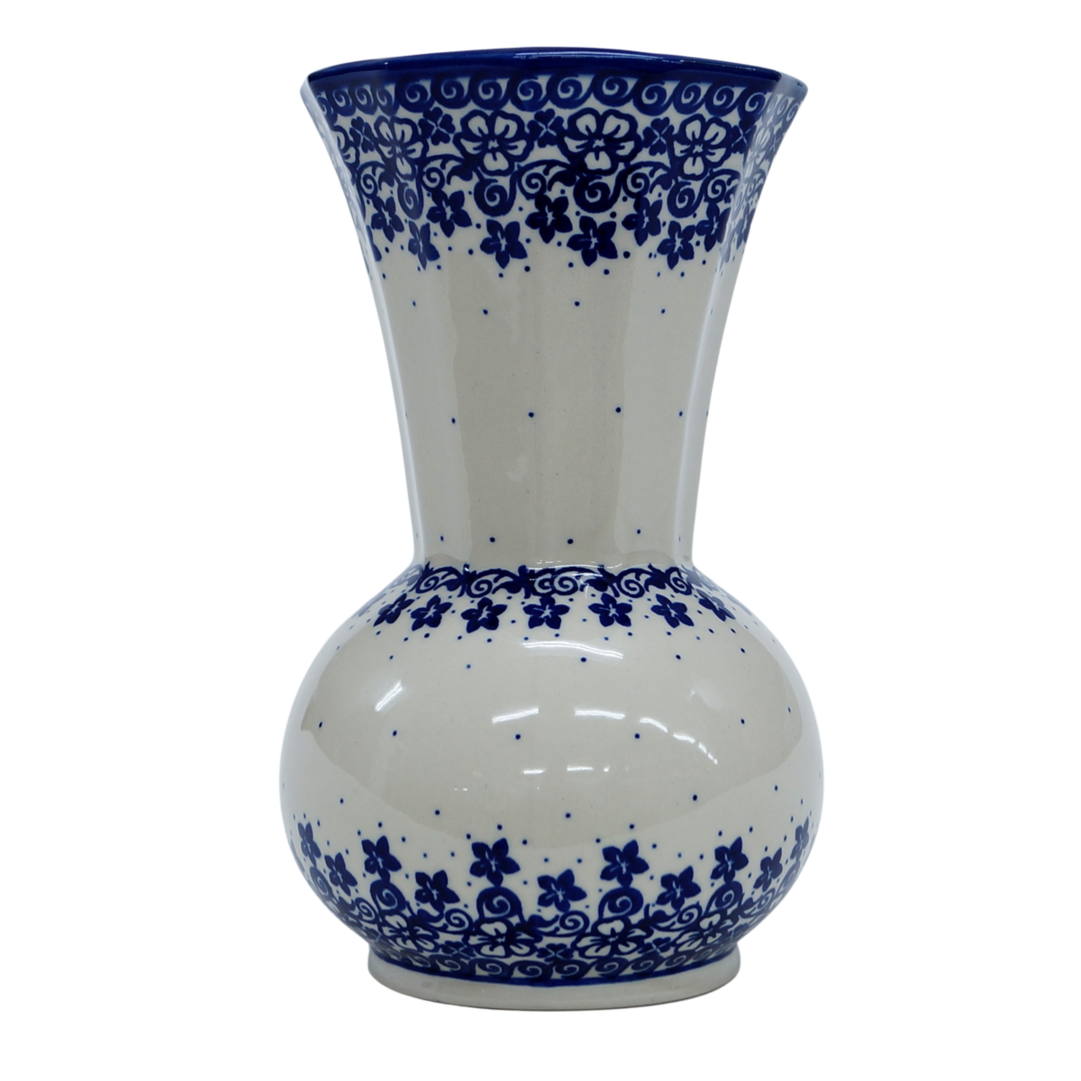 Ręcznie dekorowany w motywy kwiatowe oraz stempelkowe, zgodnie z tradycją produkcji unikatowej ceramiki z Bolesławca. Kształt wazonu w stylu nawiązującym do tradycyjnych kształtów wazonów ceramicznych, solidna konstrukcja ułatwiająca przenoszenie z kwiatami bądź innymi florystycznymi dekoracjami. Prawdziwy okaz dla koneserów rękodzieła artystycznego, dekoratorów wnętrz.