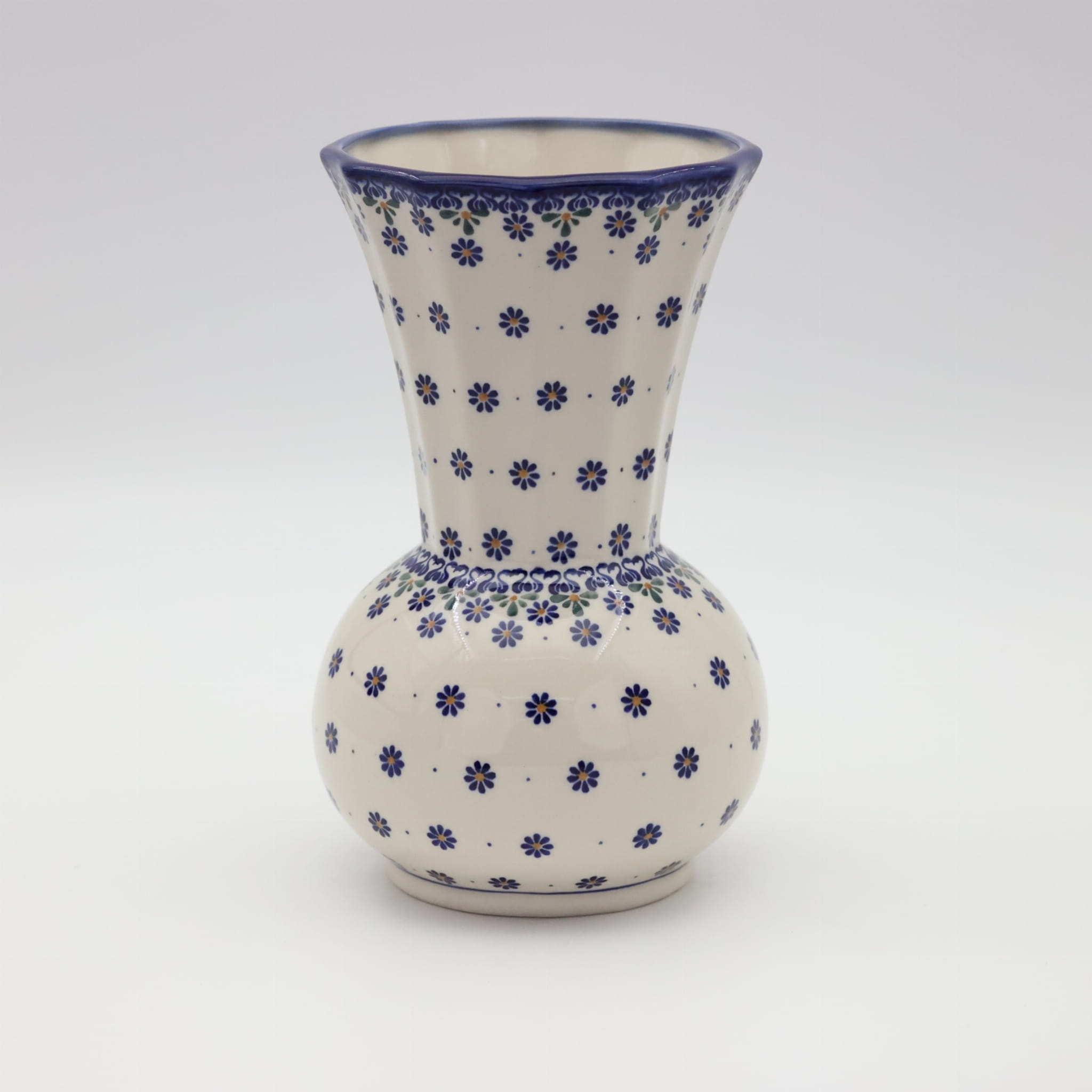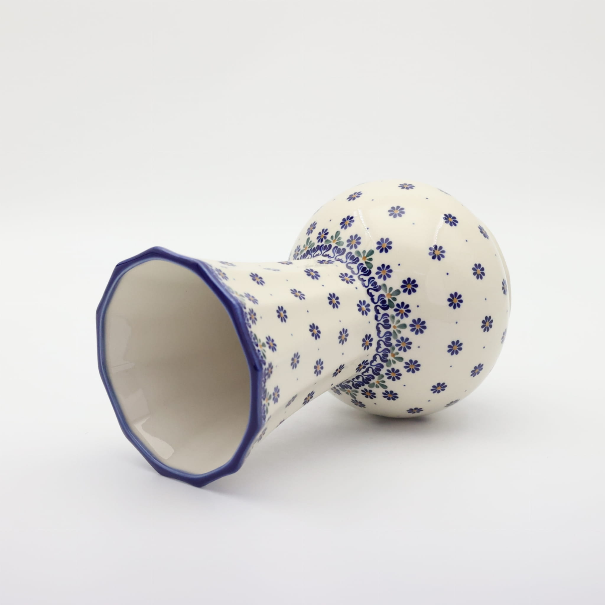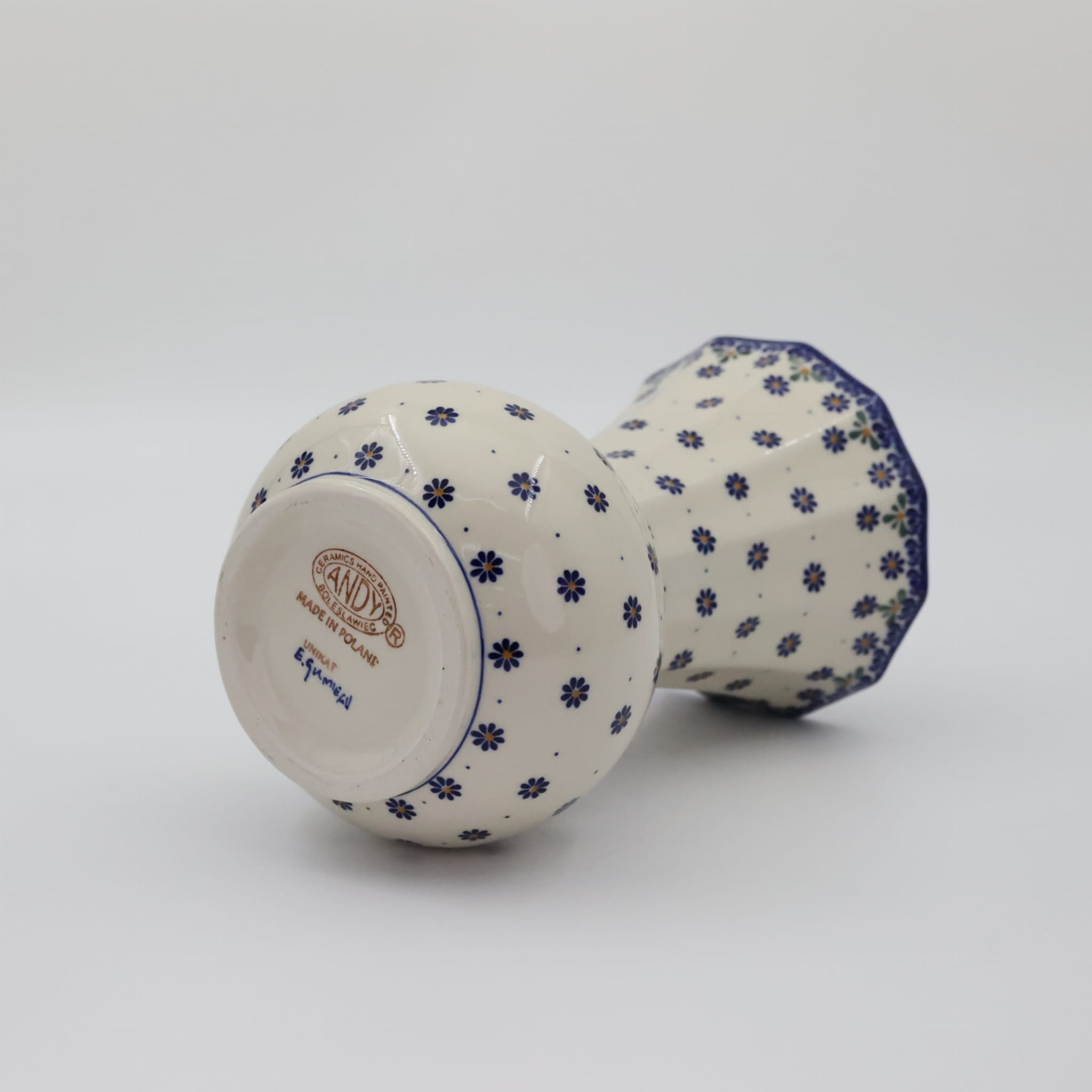 Ręcznie dekorowany w motywy kwiatowe oraz stempelkowe, zgodnie z tradycją produkcji unikatowej ceramiki z Bolesławca. Kształt wazonu w stylu nawiązującym do tradycyjnych kształtów wazonów ceramicznych, solidna konstrukcja ułatwiająca przenoszenie z kwiatami bądź innymi florystycznymi dekoracjami. Prawdziwy okaz dla koneserów rękodzieła artystycznego, dekoratorów wnętrz.