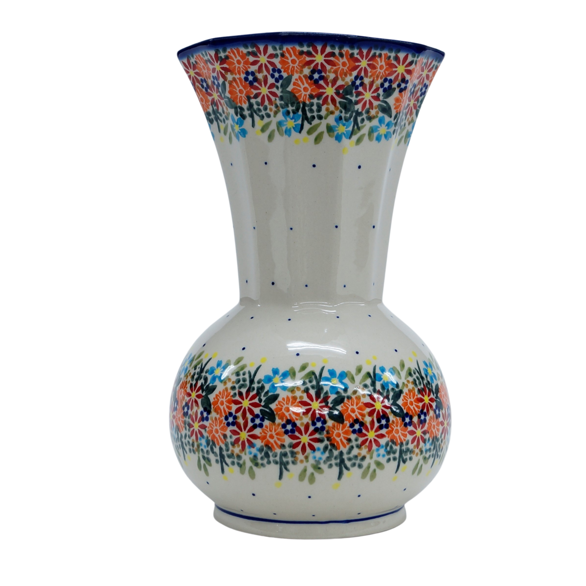 Ręcznie dekorowany w motywy kwiatowe oraz stempelkowe, zgodnie z tradycją produkcji unikatowej ceramiki z Bolesławca. Kształt wazonu w stylu nawiązującym do tradycyjnych kształtów wazonów ceramicznych, solidna konstrukcja ułatwiająca przenoszenie z kwiatami bądź innymi florystycznymi dekoracjami. Prawdziwy okaz dla koneserów rękodzieła artystycznego, dekoratorów wnętrz.