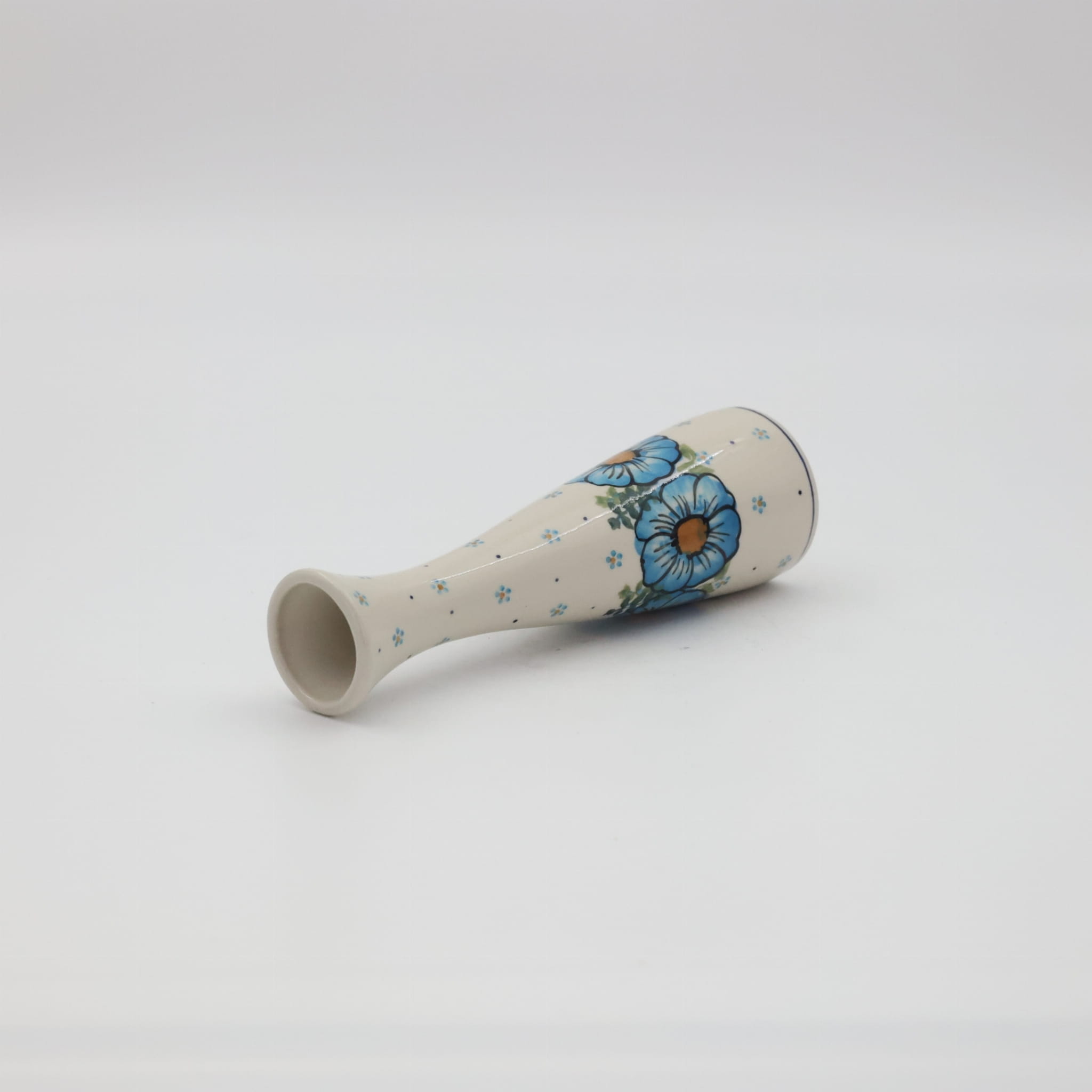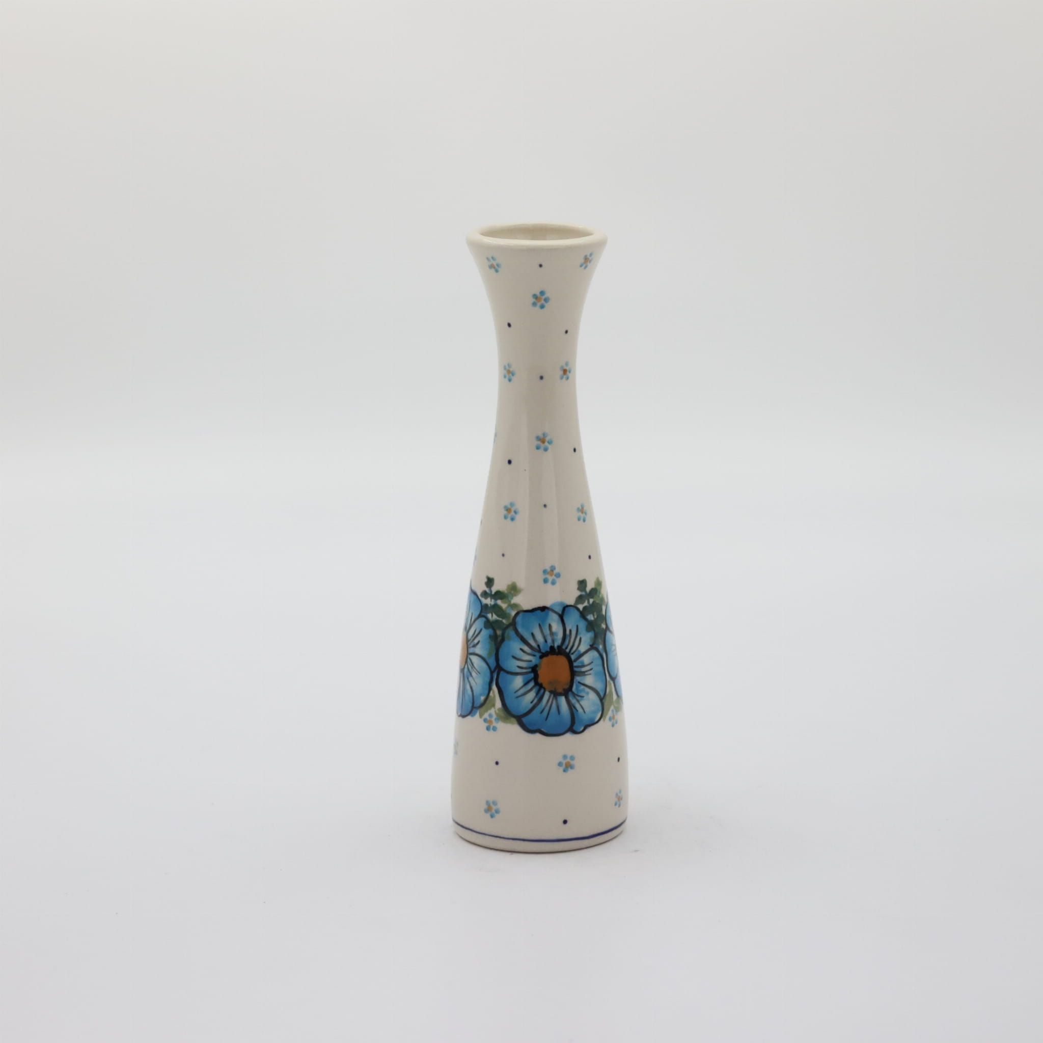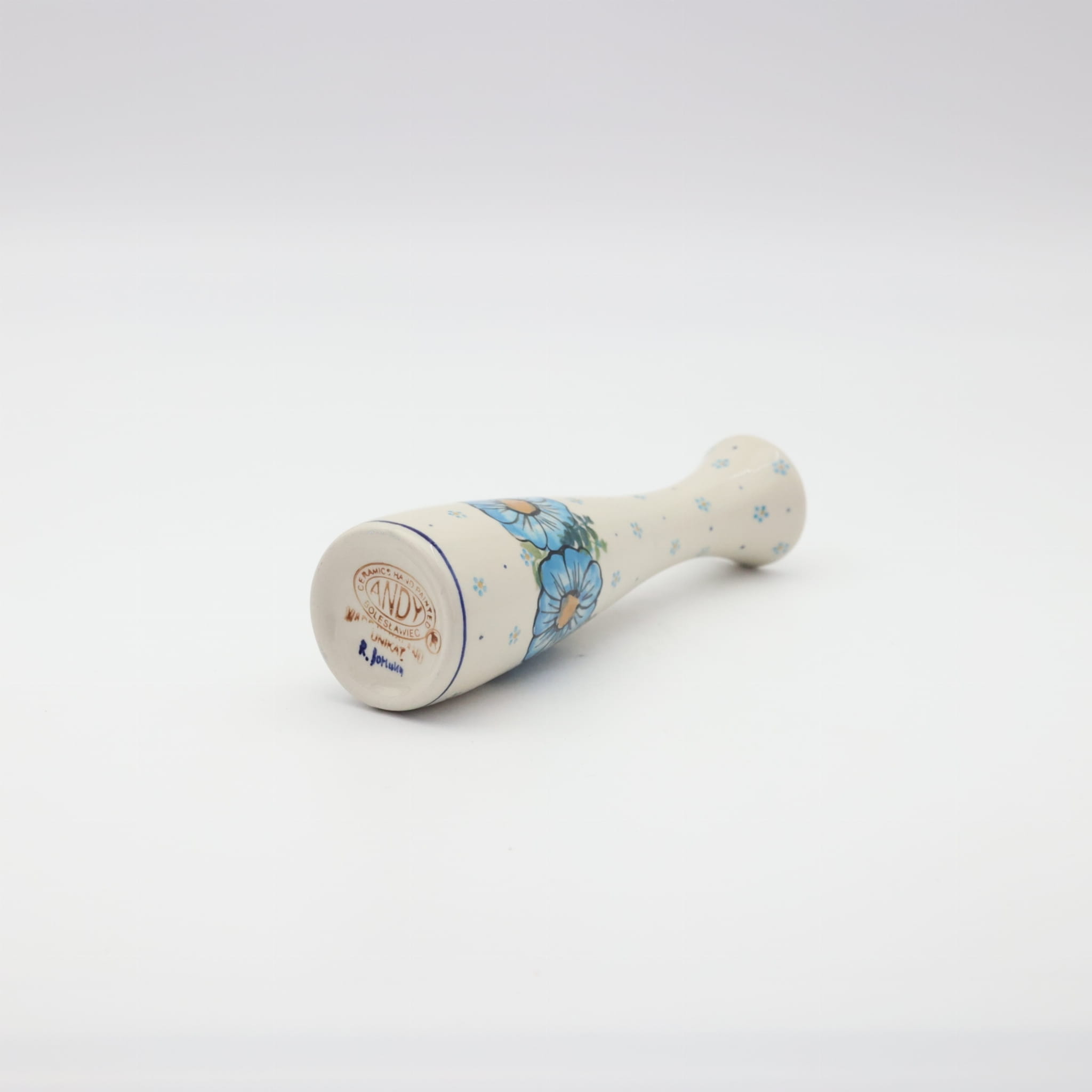 Wazon ceramiczny smukły o pojemności 200 ml, wyprodukowany w bolesławieckiej manufakturze ceramiki użytkowej, ANDY CERAMIKA. Ręcznie dekorowany bolesławiecki wazon w motywy kwiatowe oraz stempelkowe, zgodnie z tradycją produkcji unikatowej ceramiki z Bolesławca.