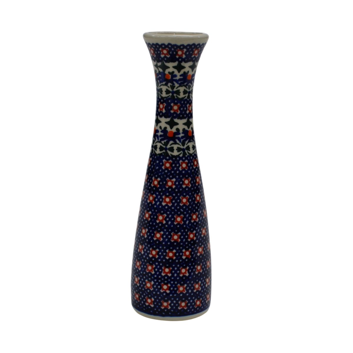 Wazon ceramiczny smukły o pojemności 200 ml, wyprodukowany w bolesławieckiej manufakturze ceramiki użytkowej, ANDY CERAMIKA. Ręcznie dekorowany bolesławiecki wazon w motywy kwiatowe oraz stempelkowe, zgodnie z tradycją produkcji unikatowej ceramiki z Bolesławca.