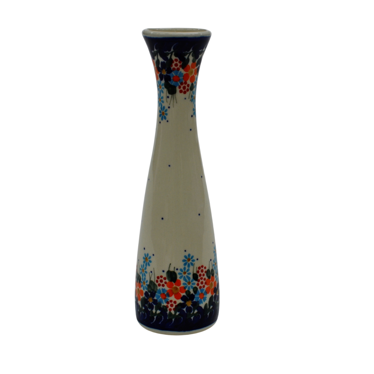 Wazon ceramiczny smukły o pojemności 200 ml, wyprodukowany w bolesławieckiej manufakturze ceramiki użytkowej, ANDY CERAMIKA. Ręcznie dekorowany bolesławiecki wazon w motywy kwiatowe oraz stempelkowe, zgodnie z tradycją produkcji unikatowej ceramiki z Bolesławca.