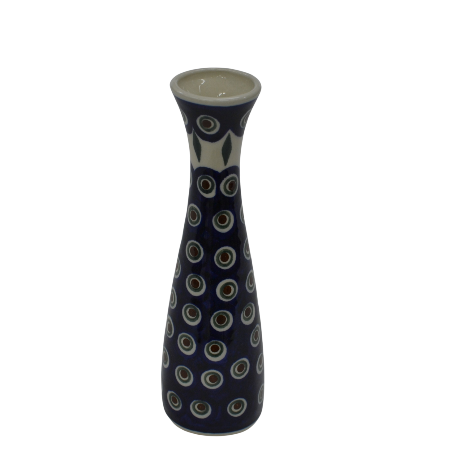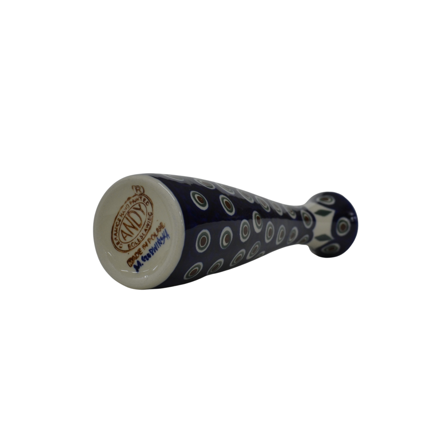 Wazon ceramiczny smukły o pojemności 200 ml, wyprodukowany w bolesławieckiej manufakturze ceramiki użytkowej, ANDY CERAMIKA. Ręcznie dekorowany bolesławiecki wazon w motywy kwiatowe oraz stempelkowe, zgodnie z tradycją produkcji unikatowej ceramiki z Bolesławca.