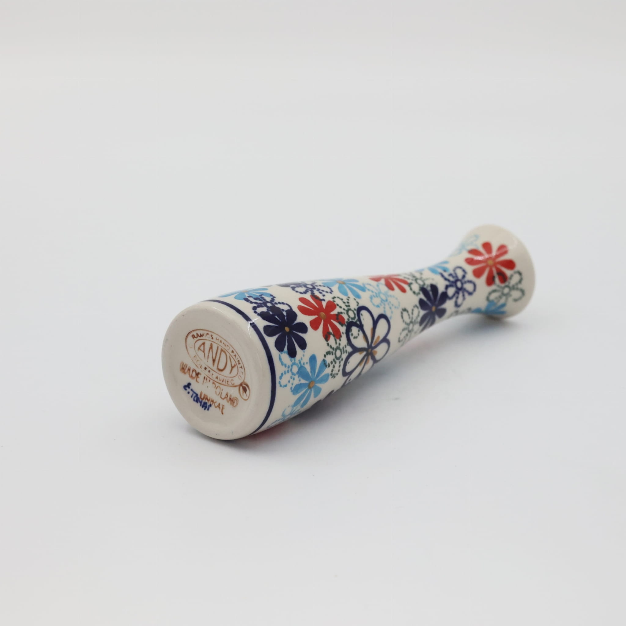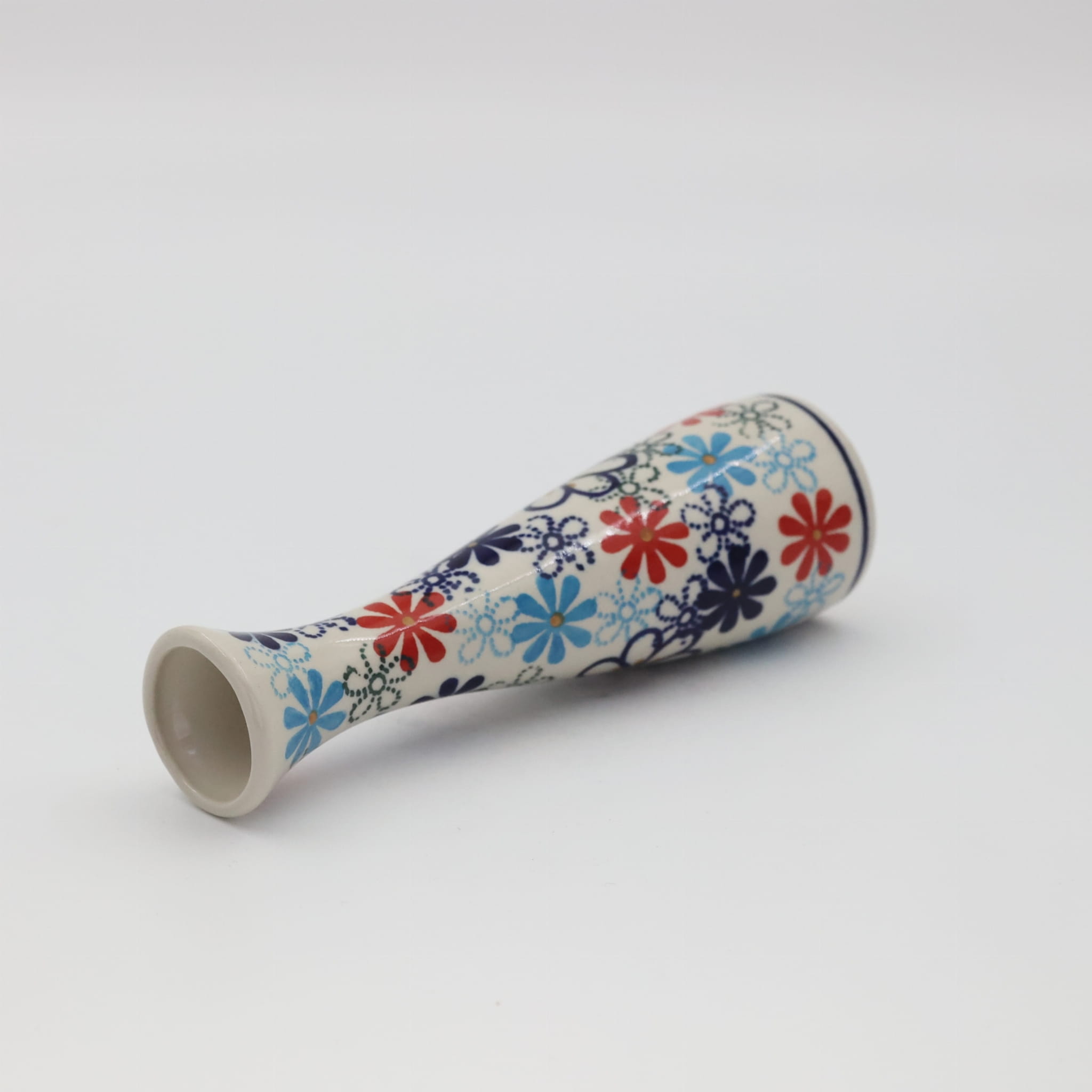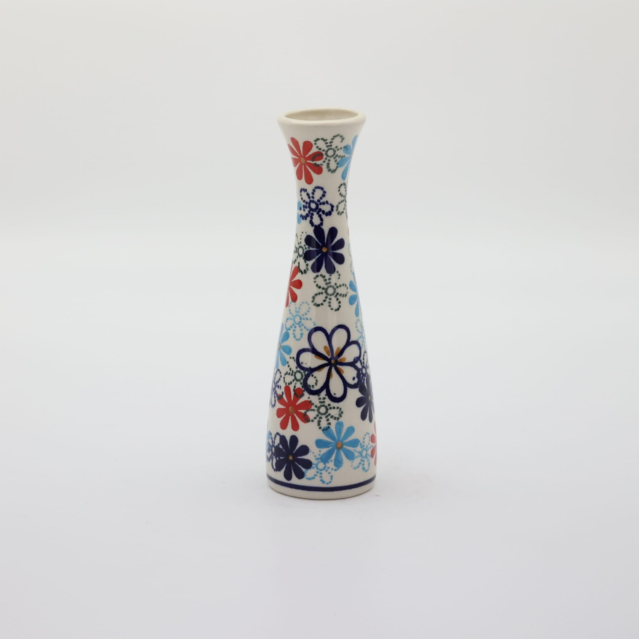 Wazon ceramiczny smukły o pojemności 200 ml, wyprodukowany w bolesławieckiej manufakturze ceramiki użytkowej, ANDY CERAMIKA. Ręcznie dekorowany bolesławiecki wazon w motywy kwiatowe oraz stempelkowe, zgodnie z tradycją produkcji unikatowej ceramiki z Bolesławca.