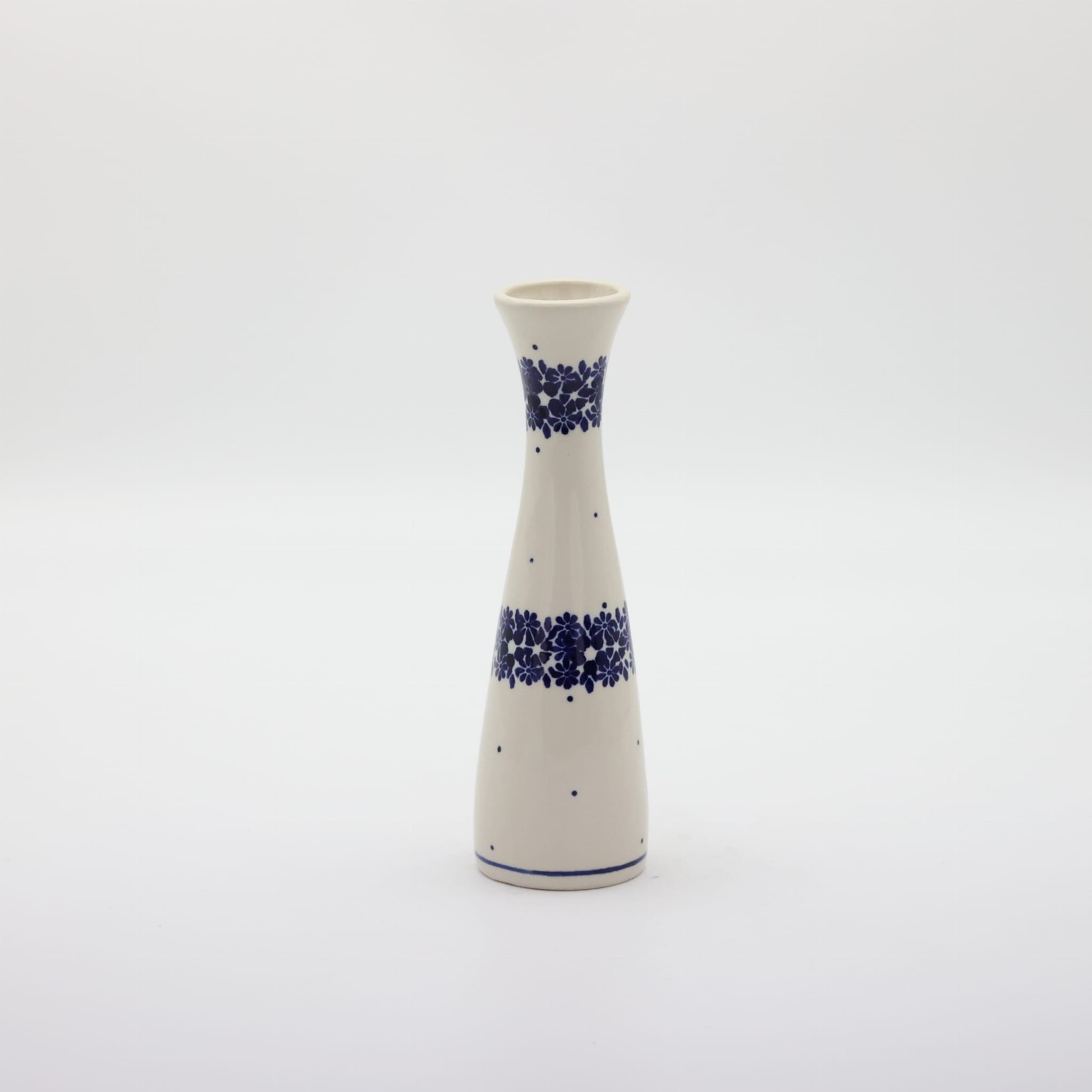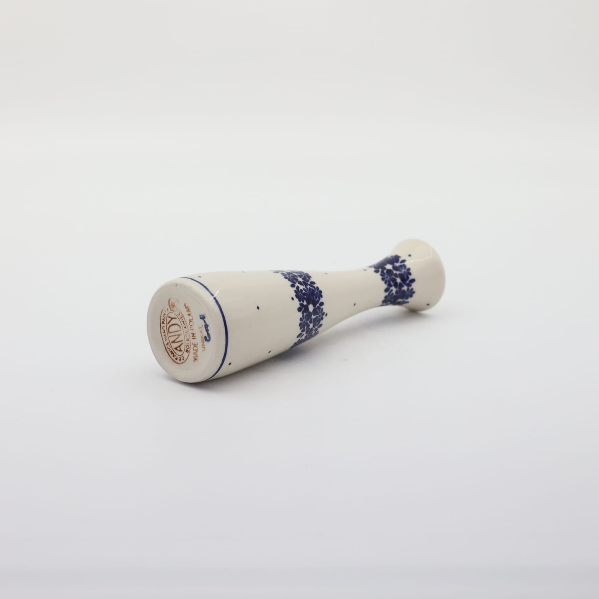 Wazon ceramiczny smukły o pojemności 200 ml, wyprodukowany w bolesławieckiej manufakturze ceramiki użytkowej, ANDY CERAMIKA. Ręcznie dekorowany bolesławiecki wazon w motywy kwiatowe oraz stempelkowe, zgodnie z tradycją produkcji unikatowej ceramiki z Bolesławca.