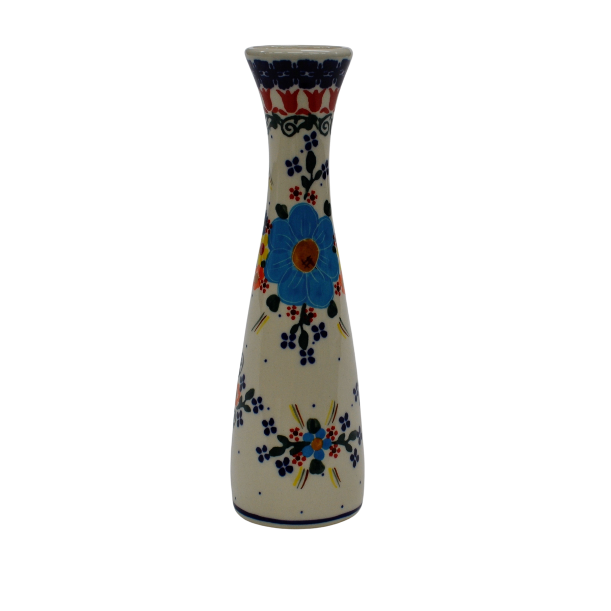 Wazon ceramiczny smukły o pojemności 200 ml, wyprodukowany w bolesławieckiej manufakturze ceramiki użytkowej, ANDY CERAMIKA. Ręcznie dekorowany bolesławiecki wazon w motywy kwiatowe oraz stempelkowe, zgodnie z tradycją produkcji unikatowej ceramiki z Bolesławca.