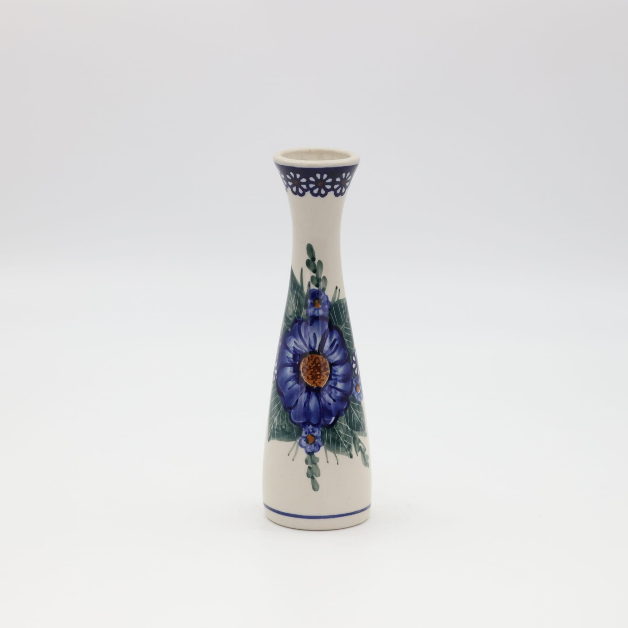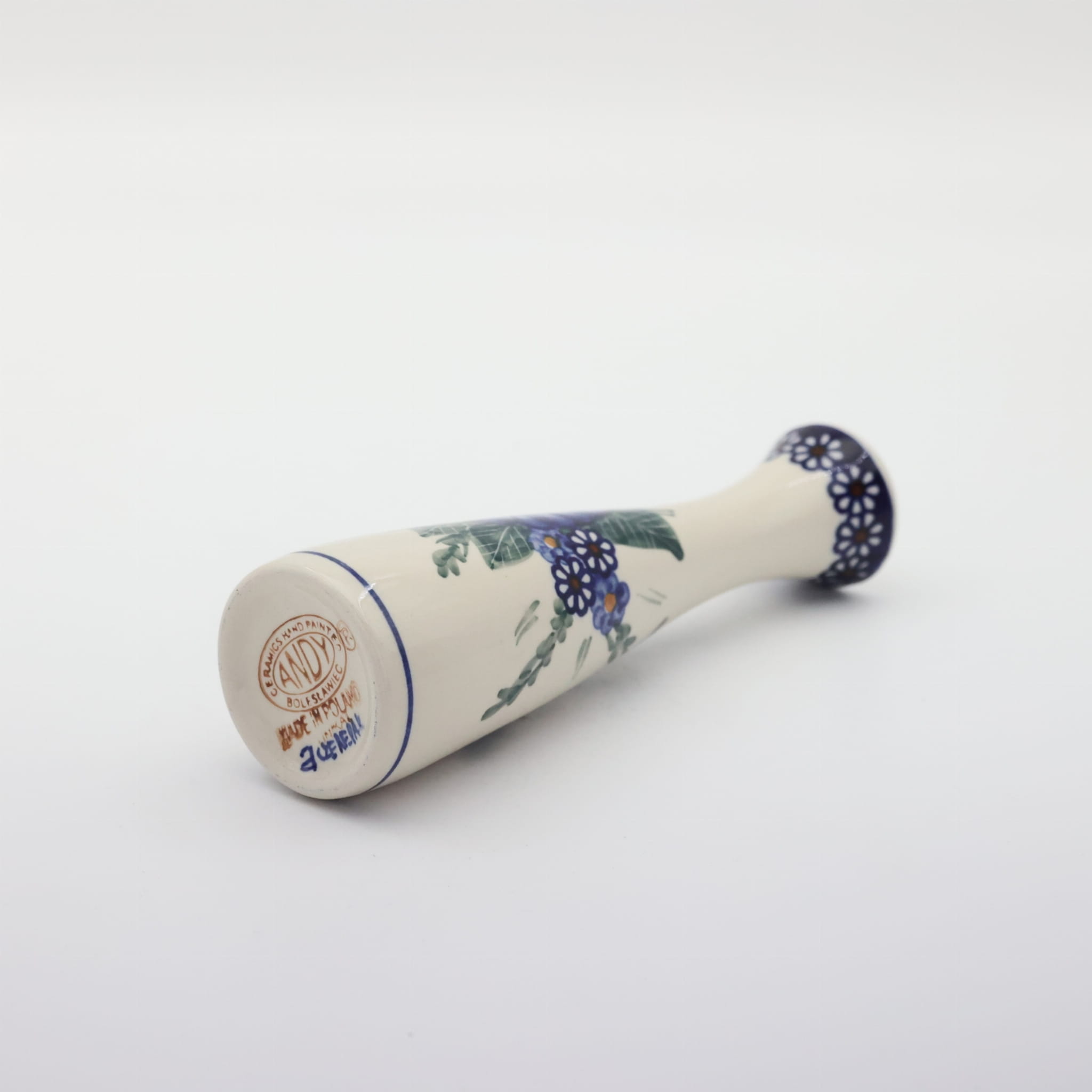 Wazon ceramiczny smukły o pojemności 200 ml, wyprodukowany w bolesławieckiej manufakturze ceramiki użytkowej, ANDY CERAMIKA. Ręcznie dekorowany bolesławiecki wazon w motywy kwiatowe oraz stempelkowe, zgodnie z tradycją produkcji unikatowej ceramiki z Bolesławca.