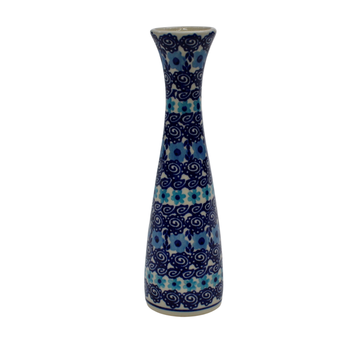 Wazon ceramiczny smukły o pojemności 200 ml, wyprodukowany w bolesławieckiej manufakturze ceramiki użytkowej, ANDY CERAMIKA. Ręcznie dekorowany bolesławiecki wazon w motywy kwiatowe oraz stempelkowe, zgodnie z tradycją produkcji unikatowej ceramiki z Bolesławca.