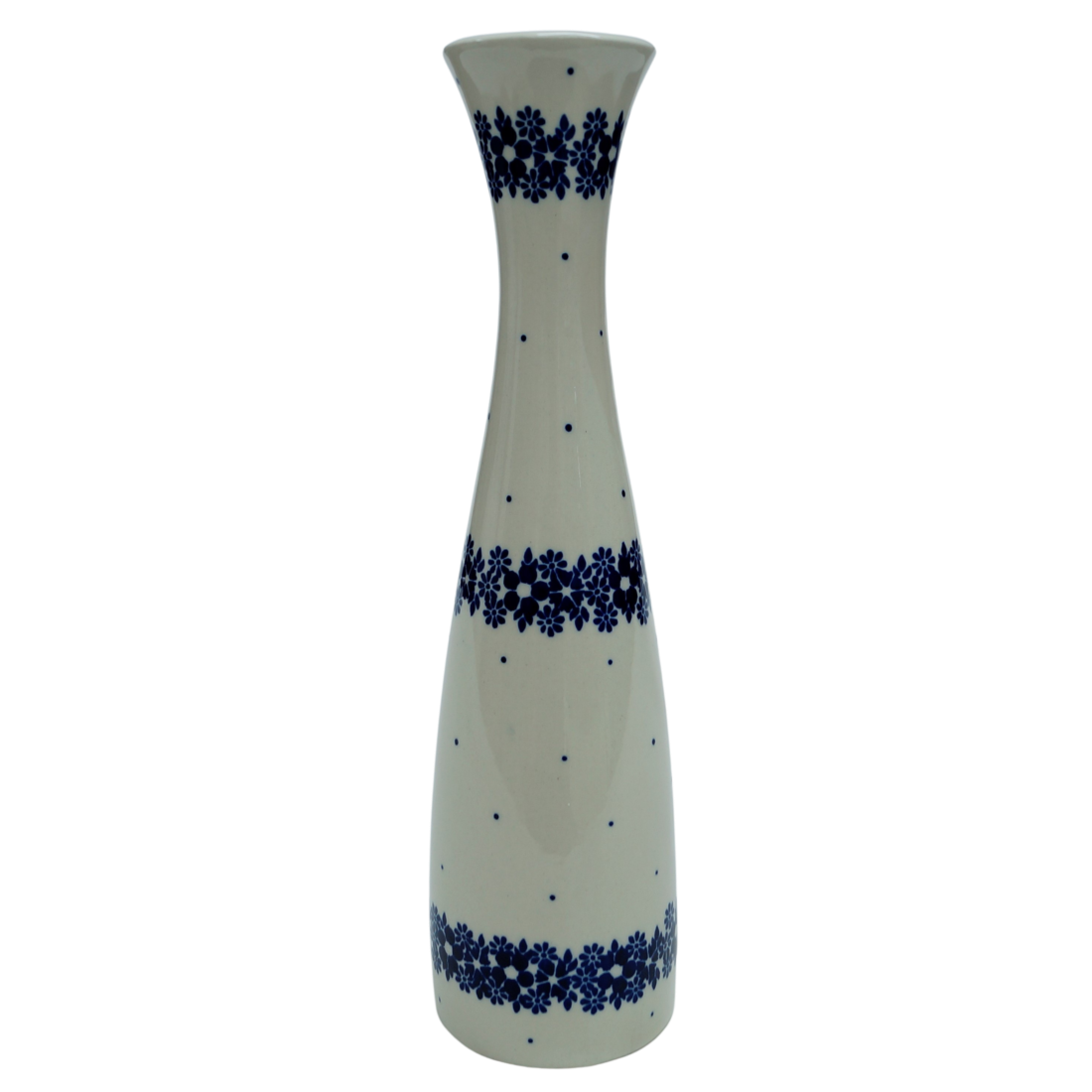 Oryginalny produkt ceramiki bolesławieckiej z zakładu ceramicznego, ANDY CERAMIKA, z Bolesławca. Wazon smukły II (duży) ręcznie malowany w tradycyjne dekoracje stempelkowe oraz motywy kwiatowe. Kształt wazonu, wykrojony w nowoczesnym stylu, smukły i wysoki, umożliwia przechowywanie wysokich kwiatów.