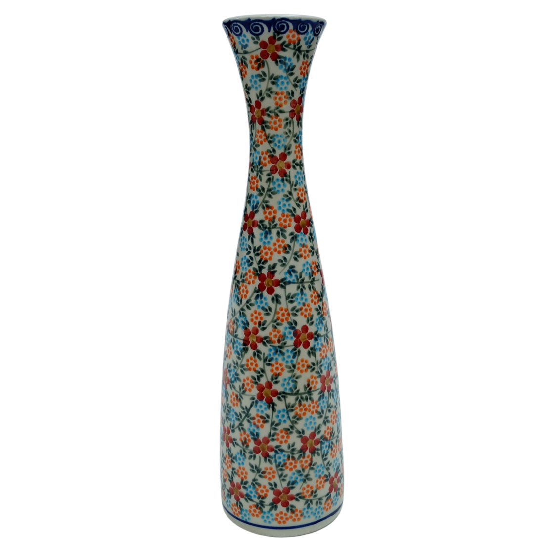 Oryginalny produkt ceramiki bolesławieckiej z zakładu ceramicznego, ANDY CERAMIKA, z Bolesławca. Wazon smukły II (duży) ręcznie malowany w tradycyjne dekoracje stempelkowe oraz motywy kwiatowe. Kształt wazonu, wykrojony w nowoczesnym stylu, smukły i wysoki, umożliwia przechowywanie wysokich kwiatów.