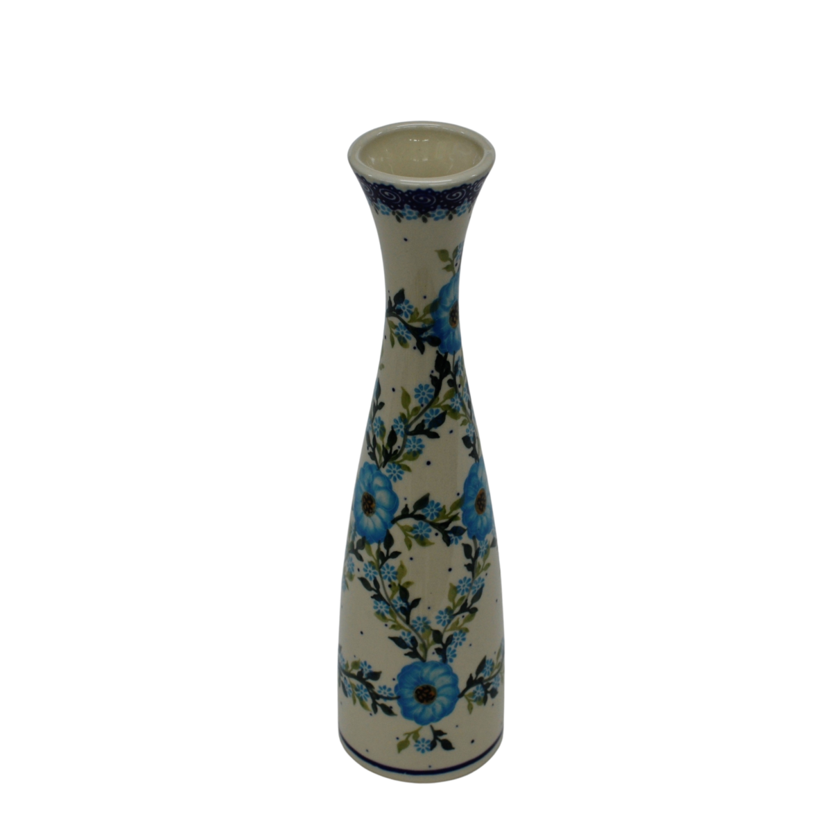 Oryginalny produkt ceramiki bolesławieckiej z zakładu ceramicznego, ANDY CERAMIKA, z Bolesławca. Wazon smukły II (duży) ręcznie malowany w tradycyjne dekoracje stempelkowe oraz motywy kwiatowe. Kształt wazonu, wykrojony w nowoczesnym stylu, smukły i wysoki, umożliwia przechowywanie wysokich kwiatów.