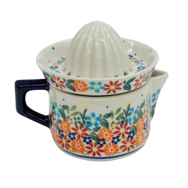 Wyciskarka malowana w tradycyjne wzory ceramiki bolesławieckiej i dekoracje kwiatowe, unikatowe znajduje wysokie zainteresowanie w gospodarstwach domowych, jest idealnym uzupełnieniem serwisu kawowego.