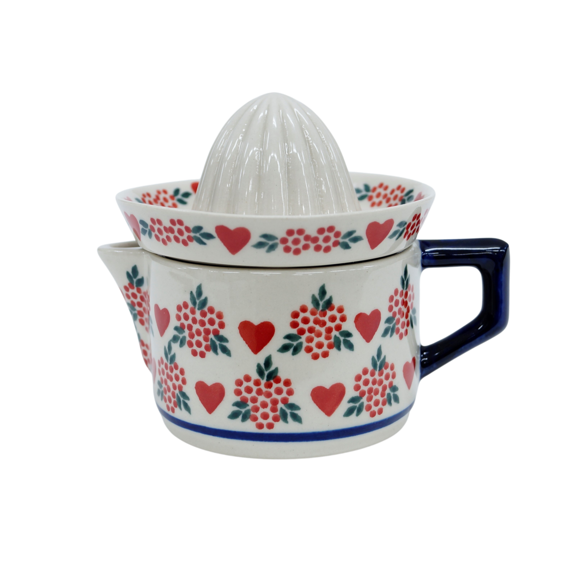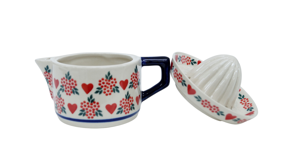 Wyciskarka malowana w tradycyjne wzory ceramiki bolesławieckiej i dekoracje kwiatowe, unikatowe znajduje wysokie zainteresowanie w gospodarstwach domowych, jest idealnym uzupełnieniem serwisu kawowego.