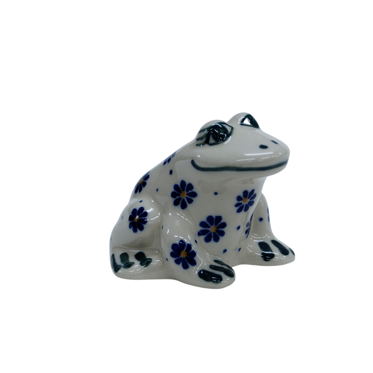 Mała ceramiczna figurka o kształcie żabki. Figurka uroczej siedzącej żabki, może stać się pomysłowym dodatkiem stołu, jako ciężarek na serwetki, w celu uchronienia ich przez podmuchami wiatru. Efektowna dekoracja dla miłośników oryginalnych ozdób ceramiki bolesławieckiej - będzie pasowała do każdego wnętrza. Świetny pomysł na prezent, jako symbol przynoszący szczęście.