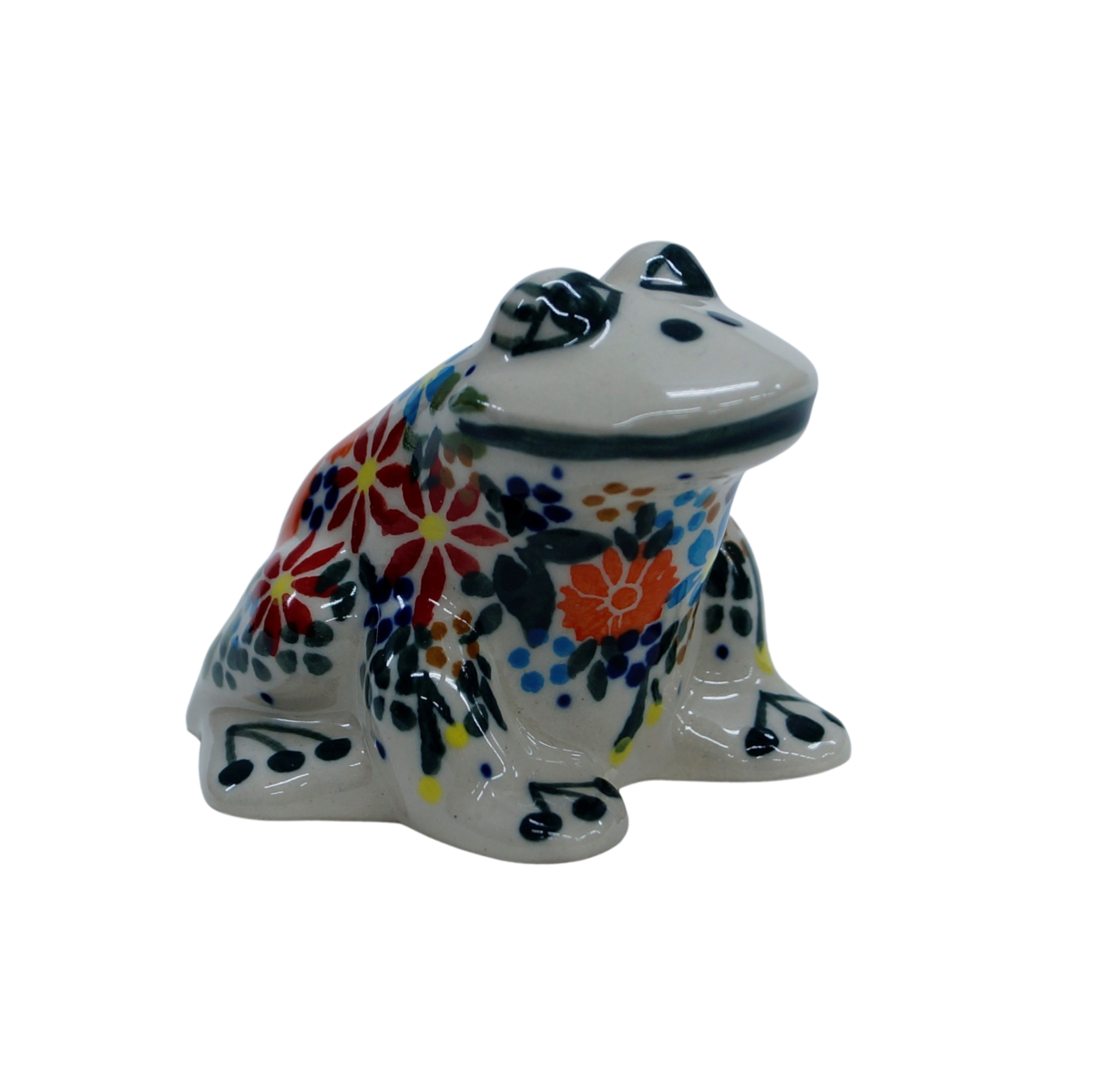Mała ceramiczna figurka o kształcie żabki. Figurka uroczej siedzącej żabki, może stać się pomysłowym dodatkiem stołu, jako ciężarek na serwetki, w celu uchronienia ich przez podmuchami wiatru. Efektowna dekoracja dla miłośników oryginalnych ozdób ceramiki bolesławieckiej - będzie pasowała do każdego wnętrza. Świetny pomysł na prezent, jako symbol przynoszący szczęście.