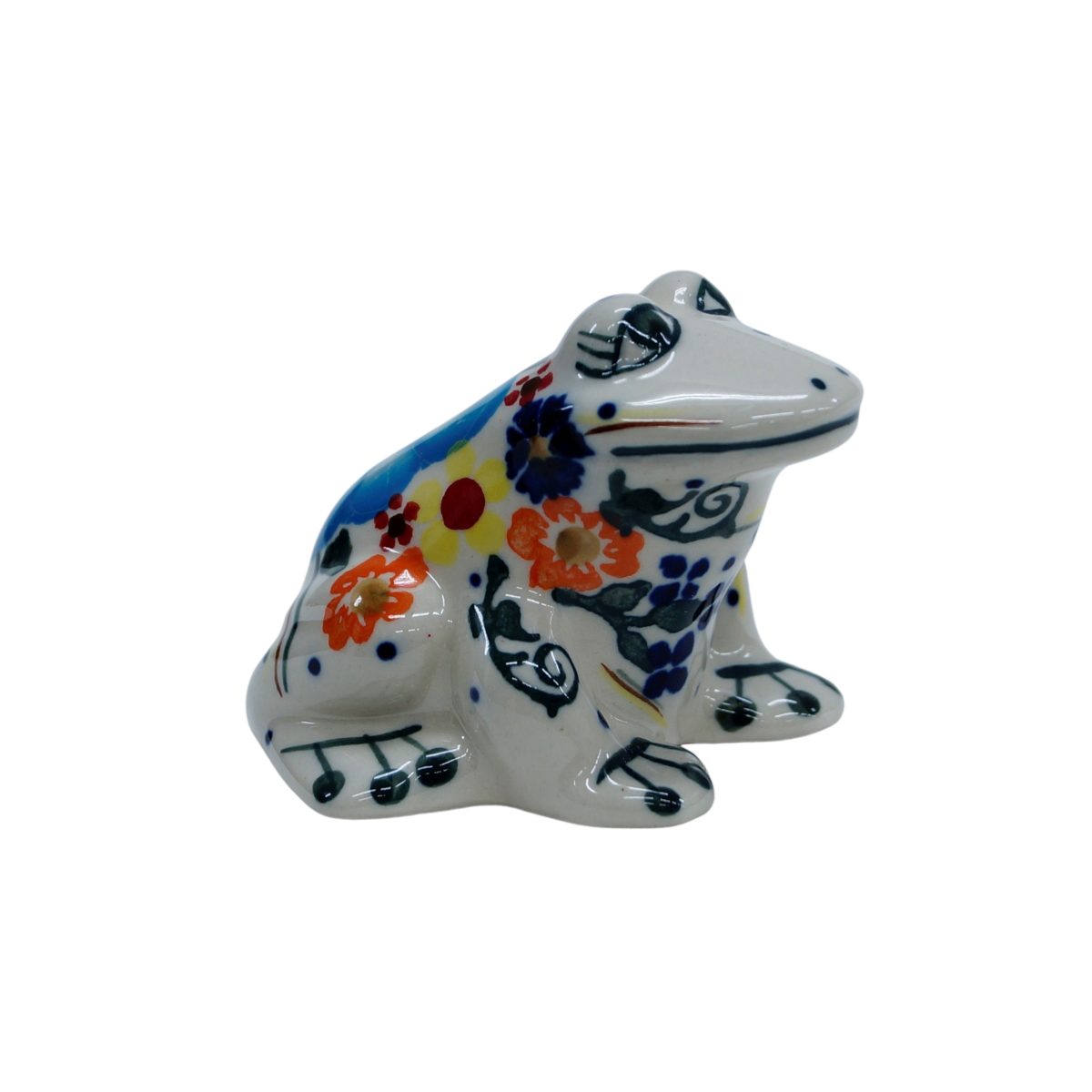 Mała ceramiczna figurka o kształcie żabki. Figurka uroczej siedzącej żabki, może stać się pomysłowym dodatkiem stołu, jako ciężarek na serwetki, w celu uchronienia ich przez podmuchami wiatru. Efektowna dekoracja dla miłośników oryginalnych ozdób ceramiki bolesławieckiej - będzie pasowała do każdego wnętrza. Świetny pomysł na prezent, jako symbol przynoszący szczęście.